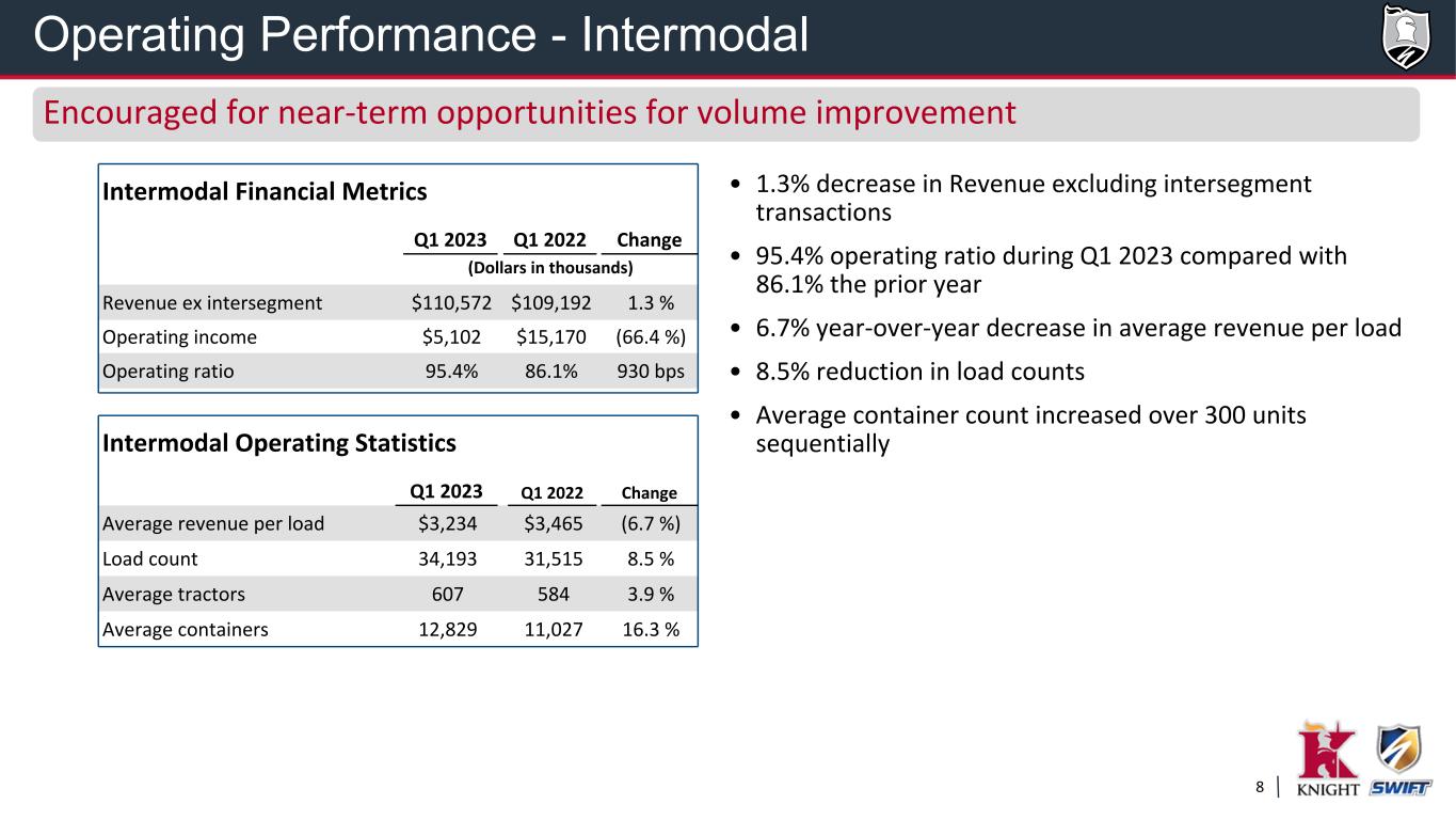 7 • 90.4% Adjusted Operating Ratio1 during the quarter, a 470 basis point deterioration from the prior year; 400 basis point deterioration sequentially • 19.8% Gross margin for Q1 representing a 40 basis point decrease from the prior year • 23.2% YoY decrease in load count as spot market remains soft 1 See GAAP to non-GAAP reconciliation in the schedules following this presentation. Operating Statistics Q1 2023 Q1 2022 Change Revenue per load $1,715 $2,697 (36.4 %) Gross margin 19.8% 20.2% (40 bps) Logistics Financial Metrics Q1 2023 Q1 2022 Change (Dollars in thousands) Revenue ex intersegment $136,777 $280,171 (51.2 %) Operating income $12,820 $39,601 (67.6 %) Adjusted Operating Income 1 $13,154 $39,935 (67.1 %) Operating ratio 90.7% 86.0% 470 bps Adjusted Operating Ratio 1 90.4% 85.7% 470 bps Solid margins in a challenging freight environment Operating Performance - Logistics Extensive Trailer Network Powers Supply Chains