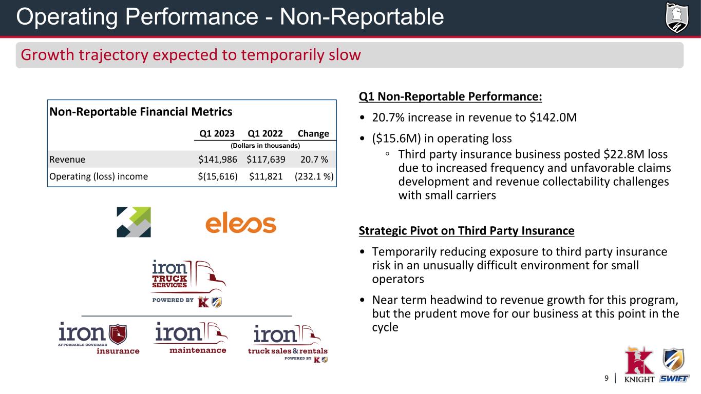 8 • 1.3% decrease in Revenue excluding intersegment transactions • 95.4% operating ratio during Q1 2023 compared with 86.1% the prior year • 6.7% year-over-year decrease in average revenue per load • 8.5% reduction in load counts • Average container count increased over 300 units sequentiallyIntermodal Operating Statistics Q1 2023 Q1 2022 Change Average revenue per load $3,234 $3,465 (6.7 %) Load count 34,193 31,515 8.5 % Average tractors 607 584 3.9 % Average containers 12,829 11,027 16.3 % Intermodal Financial Metrics Q1 2023 Q1 2022 Change (Dollars in thousands) Revenue ex intersegment $110,572 $109,192 1.3 % Operating income $5,102 $15,170 (66.4 %) Operating ratio 95.4% 86.1% 930 bps Operating Performance - Intermodal Encouraged for near-term opportunities for volume improvement