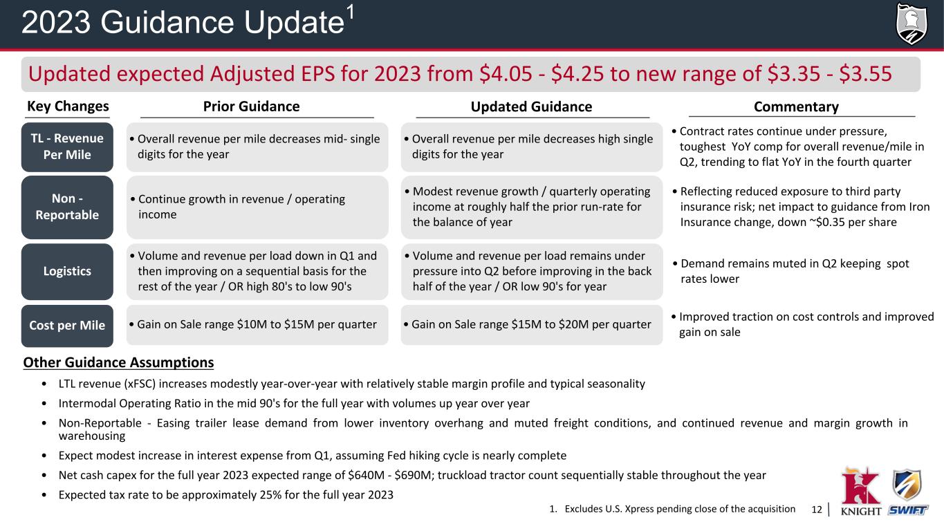 11 • Continued softness in freight demand with non-contract rates trending below contract rates through the first half of 2023 as shippers work through higher inventory levels • Capacity continues to exit at an accelerating rate • Freight volumes begin to improve during 2nd half of the year with a more typical peak season • Spot pricing bottoms out in 2Q and begins recovering in 2nd half of 2023 • Expect trailer pool service to continue to be a differentiator when demand recovers • LTL demand pressured but remains more stable than truckload • LTL improvement in revenue (excluding fuel) per hundredweight year-over-year • Inflationary pressures ease in many cost areas but remain elevated on a year-over-year basis • Equipment and labor availability continues to improve, particularly for large carriers • Demand in the used equipment market weakens as small carriers struggle Market Outlook