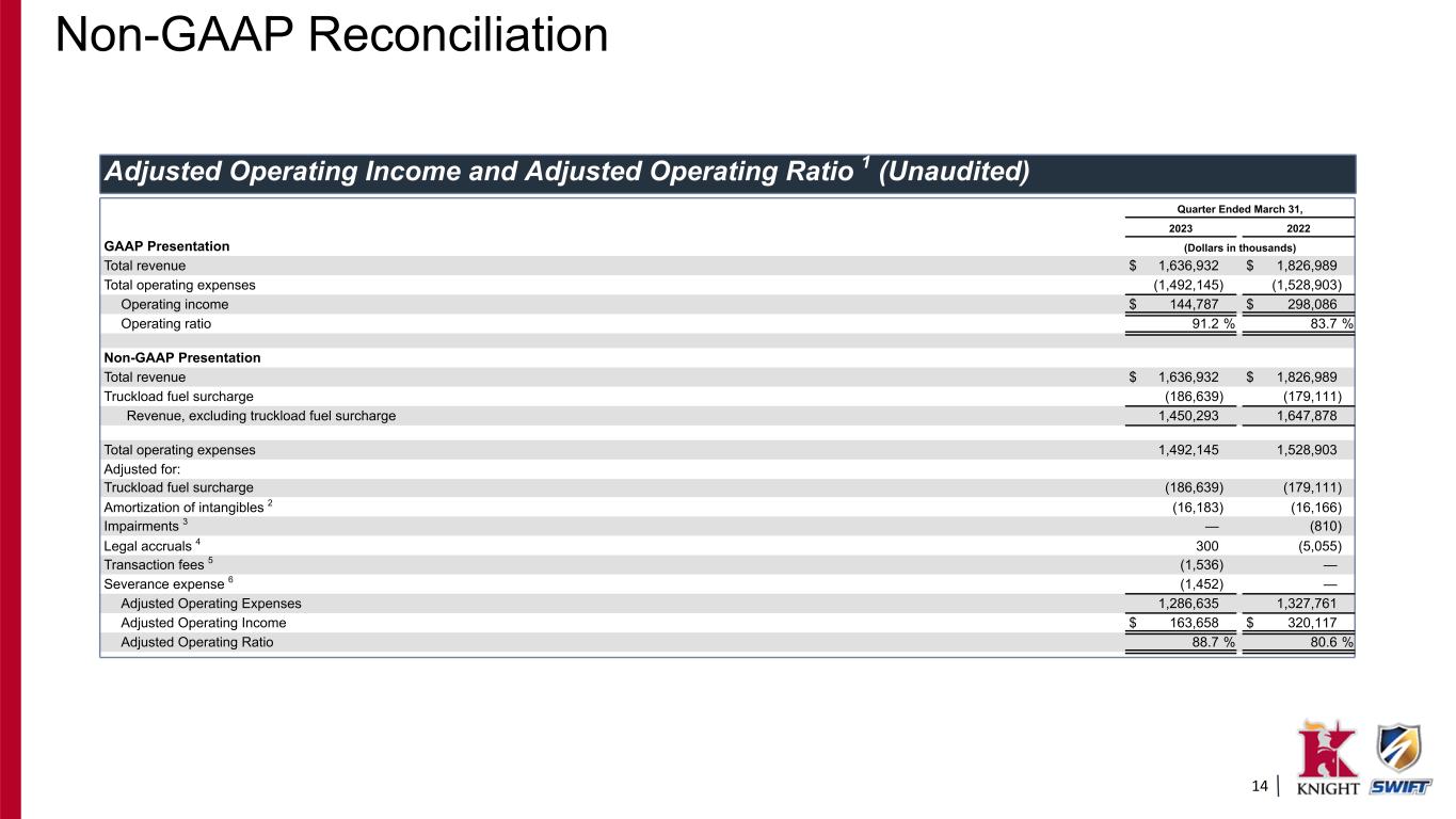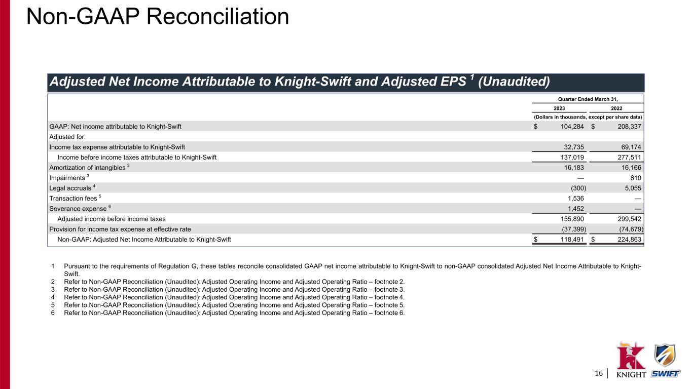 15 Adjusted Operating Income and Adjusted Operating Ratio (Unaudited) 1 Pursuant to the requirements of Regulation G, this table reconciles consolidated GAAP operating ratio to consolidated non-GAAP Adjusted Operating Ratio. 2 "Amortization of intangibles" reflects the non-cash amortization expense relating to intangible assets identified in the 2017 Merger, the July 5, 2021 ACT acquisition and other acquisitions. 3 "Impairments" reflects the non-cash impairment of building improvements (within our non-reportable segments). 4 "Legal accruals" are included in "Miscellaneous operating expenses" in the condensed consolidated statements of comprehensive income and reflect the following: • First quarter 2023 legal expense reflects a decrease in the estimated exposure related to an accrued legal matter previously identified as probable and estimable in prior periods based on a recent settlement agreement. • First quarter 2022 legal expense reflects costs related to certain settlements and class action lawsuits arising from employee and contract related matters. 5 "Transaction fees" reflects certain legal and professional fees associated with the planned acquisition of U.S. Xpress. The transaction fees are included within "Miscellaneous operating expenses" in the condensed statements of comprehensive income. 6 "Severance expense" is included within "Salaries, wages, and benefits" in the condensed statements of comprehensive income. Non-GAAP Reconciliation