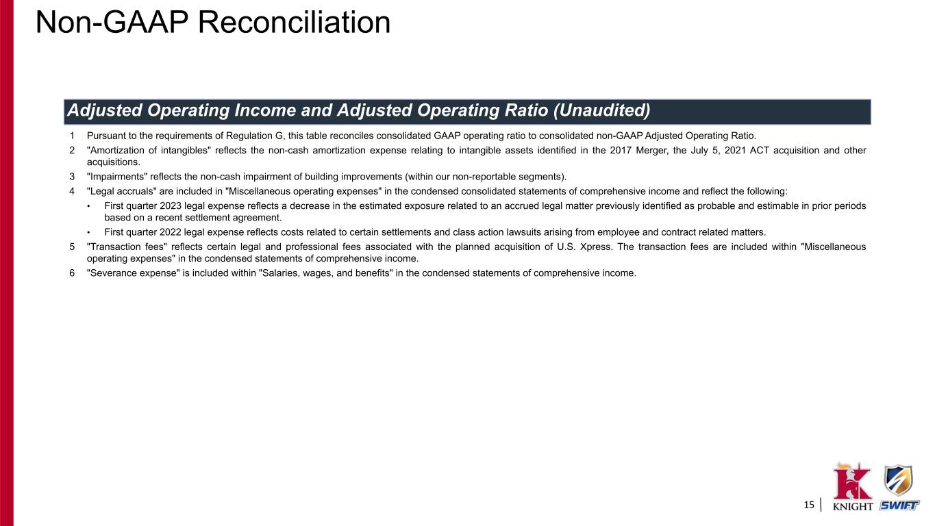 14 Adjusted Operating Income and Adjusted Operating Ratio 1 (Unaudited) Quarter Ended March 31, 2023 2022 GAAP Presentation (Dollars in thousands) Total revenue $ 1,636,932 $ 1,826,989 Total operating expenses (1,492,145) (1,528,903) Operating income $ 144,787 $ 298,086 Operating ratio 91.2 % 83.7 % Non-GAAP Presentation Total revenue $ 1,636,932 $ 1,826,989 Truckload fuel surcharge (186,639) (179,111) Revenue, excluding truckload fuel surcharge 1,450,293 1,647,878 Total operating expenses 1,492,145 1,528,903 Adjusted for: Truckload fuel surcharge (186,639) (179,111) Amortization of intangibles 2 (16,183) (16,166) Impairments 3 — (810) Legal accruals 4 300 (5,055) Transaction fees 5 (1,536) — Severance expense 6 (1,452) — Adjusted Operating Expenses 1,286,635 1,327,761 Adjusted Operating Income $ 163,658 $ 320,117 Adjusted Operating Ratio 88.7 % 80.6 % Non-GAAP Reconciliation