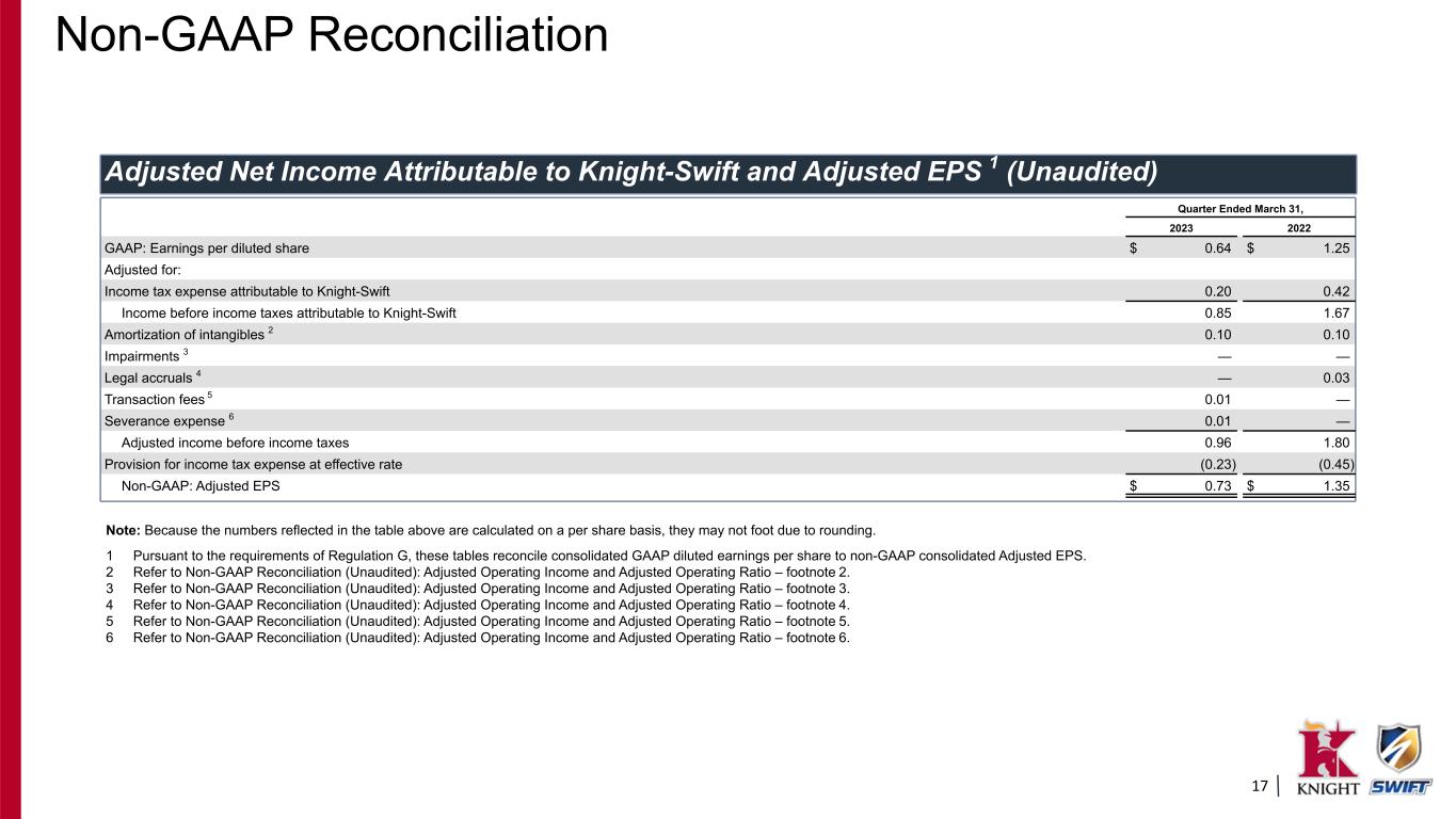 16 Adjusted Net Income Attributable to Knight-Swift and Adjusted EPS 1 (Unaudited) Quarter Ended March 31, 2023 2022 (Dollars in thousands, except per share data) GAAP: Net income attributable to Knight-Swift $ 104,284 $ 208,337 Adjusted for: Income tax expense attributable to Knight-Swift 32,735 69,174 Income before income taxes attributable to Knight-Swift 137,019 277,511 Amortization of intangibles 2 16,183 16,166 Impairments 3 — 810 Legal accruals 4 (300) 5,055 Transaction fees 5 1,536 — Severance expense 6 1,452 — Adjusted income before income taxes 155,890 299,542 Provision for income tax expense at effective rate (37,399) (74,679) Non-GAAP: Adjusted Net Income Attributable to Knight-Swift $ 118,491 $ 224,863 1 Pursuant to the requirements of Regulation G, these tables reconcile consolidated GAAP net income attributable to Knight-Swift to non-GAAP consolidated Adjusted Net Income Attributable to Knight- Swift. 2 Refer to Non-GAAP Reconciliation (Unaudited): Adjusted Operating Income and Adjusted Operating Ratio – footnote 2. 3 Refer to Non-GAAP Reconciliation (Unaudited): Adjusted Operating Income and Adjusted Operating Ratio – footnote 3. 4 Refer to Non-GAAP Reconciliation (Unaudited): Adjusted Operating Income and Adjusted Operating Ratio – footnote 4. 5 Refer to Non-GAAP Reconciliation (Unaudited): Adjusted Operating Income and Adjusted Operating Ratio – footnote 5. 6 Refer to Non-GAAP Reconciliation (Unaudited): Adjusted Operating Income and Adjusted Operating Ratio – footnote 6. Non-GAAP Reconciliation