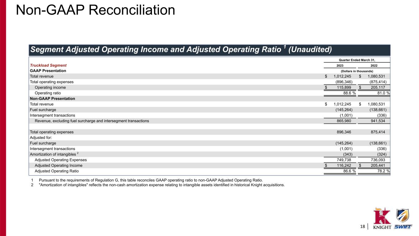 17 Adjusted Net Income Attributable to Knight-Swift and Adjusted EPS 1 (Unaudited) Quarter Ended March 31, 2023 2022 GAAP: Earnings per diluted share $ 0.64 $ 1.25 Adjusted for: Income tax expense attributable to Knight-Swift 0.20 0.42 Income before income taxes attributable to Knight-Swift 0.85 1.67 Amortization of intangibles 2 0.10 0.10 Impairments 3 — — Legal accruals 4 — 0.03 Transaction fees 5 0.01 — Severance expense 6 0.01 — Adjusted income before income taxes 0.96 1.80 Provision for income tax expense at effective rate (0.23) (0.45) Non-GAAP: Adjusted EPS $ 0.73 $ 1.35 Note: Because the numbers reflected in the table above are calculated on a per share basis, they may not foot due to rounding. 1 Pursuant to the requirements of Regulation G, these tables reconcile consolidated GAAP diluted earnings per share to non-GAAP consolidated Adjusted EPS. 2 Refer to Non-GAAP Reconciliation (Unaudited): Adjusted Operating Income and Adjusted Operating Ratio – footnote 2. 3 Refer to Non-GAAP Reconciliation (Unaudited): Adjusted Operating Income and Adjusted Operating Ratio – footnote 3. 4 Refer to Non-GAAP Reconciliation (Unaudited): Adjusted Operating Income and Adjusted Operating Ratio – footnote 4. 5 Refer to Non-GAAP Reconciliation (Unaudited): Adjusted Operating Income and Adjusted Operating Ratio – footnote 5. 6 Refer to Non-GAAP Reconciliation (Unaudited): Adjusted Operating Income and Adjusted Operating Ratio – footnote 6. Non-GAAP Reconciliation