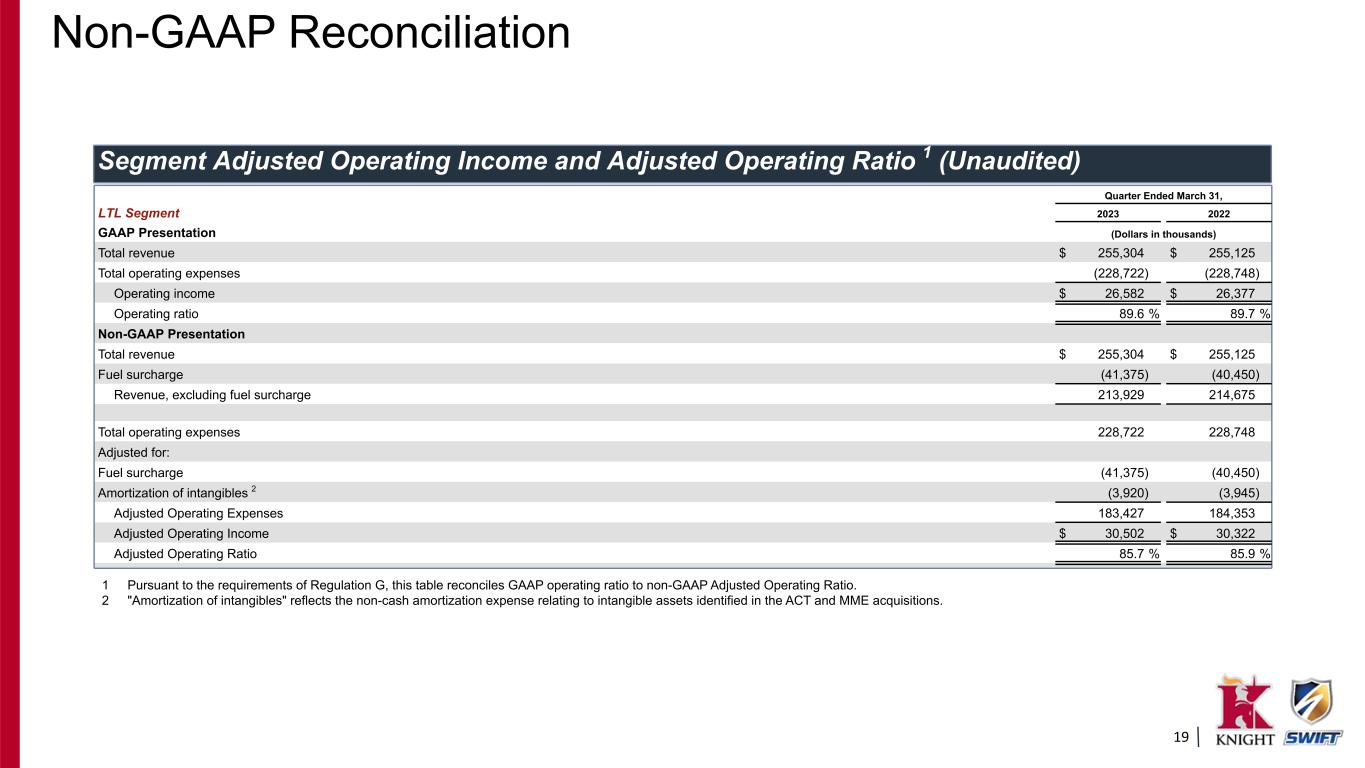 18 Segment Adjusted Operating Income and Adjusted Operating Ratio 1 (Unaudited) Quarter Ended March 31, Truckload Segment 2023 2022 GAAP Presentation (Dollars in thousands) Total revenue $ 1,012,245 $ 1,080,531 Total operating expenses (896,346) (875,414) Operating income $ 115,899 $ 205,117 Operating ratio 88.6 % 81.0 % Non-GAAP Presentation Total revenue $ 1,012,245 $ 1,080,531 Fuel surcharge (145,264) (138,661) Intersegment transactions (1,001) (336) Revenue, excluding fuel surcharge and intersegment transactions 865,980 941,534 Total operating expenses 896,346 875,414 Adjusted for: Fuel surcharge (145,264) (138,661) Intersegment transactions (1,001) (336) Amortization of intangibles 2 (343) (324) Adjusted Operating Expenses 749,738 736,093 Adjusted Operating Income $ 116,242 $ 205,441 Adjusted Operating Ratio 86.6 % 78.2 % 1 Pursuant to the requirements of Regulation G, this table reconciles GAAP operating ratio to non-GAAP Adjusted Operating Ratio. 2 "Amortization of intangibles" reflects the non-cash amortization expense relating to intangible assets identified in historical Knight acquisitions. Non-GAAP Reconciliation