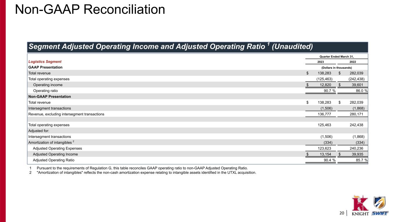 19 Segment Adjusted Operating Income and Adjusted Operating Ratio 1 (Unaudited) Quarter Ended March 31, LTL Segment 2023 2022 GAAP Presentation (Dollars in thousands) Total revenue $ 255,304 $ 255,125 Total operating expenses (228,722) (228,748) Operating income $ 26,582 $ 26,377 Operating ratio 89.6 % 89.7 % Non-GAAP Presentation Total revenue $ 255,304 $ 255,125 Fuel surcharge (41,375) (40,450) Revenue, excluding fuel surcharge 213,929 214,675 Total operating expenses 228,722 228,748 Adjusted for: Fuel surcharge (41,375) (40,450) Amortization of intangibles 2 (3,920) (3,945) Adjusted Operating Expenses 183,427 184,353 Adjusted Operating Income $ 30,502 $ 30,322 Adjusted Operating Ratio 85.7 % 85.9 % 1 Pursuant to the requirements of Regulation G, this table reconciles GAAP operating ratio to non-GAAP Adjusted Operating Ratio. 2 "Amortization of intangibles" reflects the non-cash amortization expense relating to intangible assets identified in the ACT and MME acquisitions. Non-GAAP Reconciliation