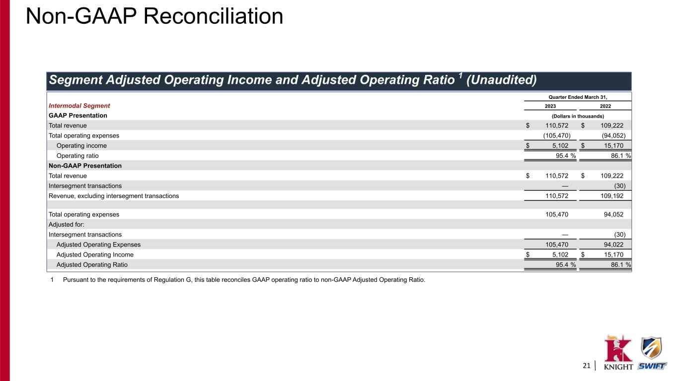 20 Quarter Ended March 31, Logistics Segment 2023 2022 GAAP Presentation (Dollars in thousands) Total revenue $ 138,283 $ 282,039 Total operating expenses (125,463) (242,438) Operating income $ 12,820 $ 39,601 Operating ratio 90.7 % 86.0 % Non-GAAP Presentation Total revenue $ 138,283 $ 282,039 Intersegment transactions (1,506) (1,868) Revenue, excluding intersegment transactions 136,777 280,171 Total operating expenses 125,463 242,438 Adjusted for: Intersegment transactions (1,506) (1,868) Amortization of intangibles 2 (334) (334) Adjusted Operating Expenses 123,623 240,236 Adjusted Operating Income $ 13,154 $ 39,935 Adjusted Operating Ratio 90.4 % 85.7 % Segment Adjusted Operating Income and Adjusted Operating Ratio 1 (Unaudited) 1 Pursuant to the requirements of Regulation G, this table reconciles GAAP operating ratio to non-GAAP Adjusted Operating Ratio. 2 "Amortization of intangibles" reflects the non-cash amortization expense relating to intangible assets identified in the UTXL acquisition. Non-GAAP Reconciliation