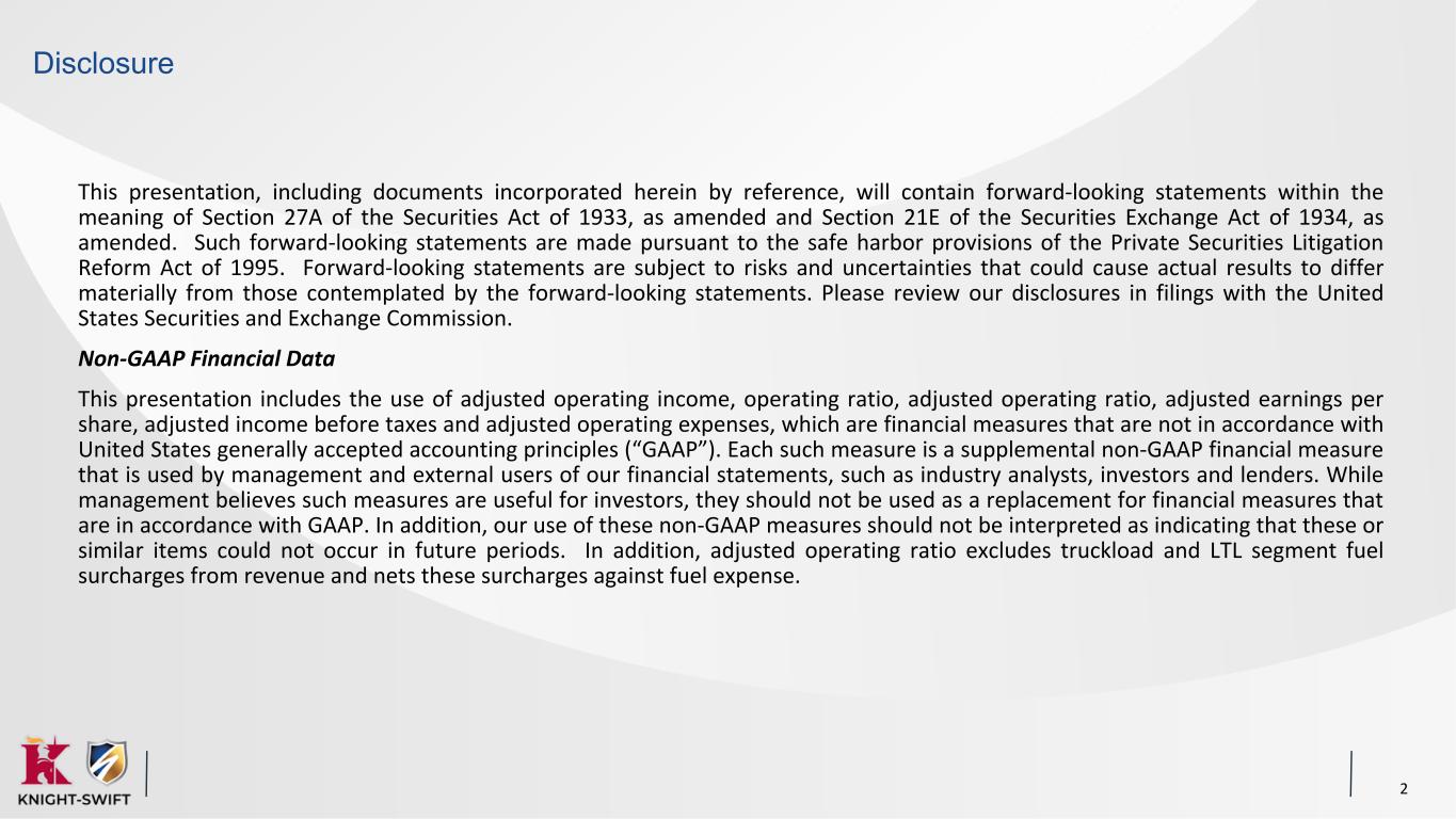 2 This presentation, including documents incorporated herein by reference, will contain forward-looking statements within the meaning of Section 27A of the Securities Act of 1933, as amended and Section 21E of the Securities Exchange Act of 1934, as amended. Such forward-looking statements are made pursuant to the safe harbor provisions of the Private Securities Litigation Reform Act of 1995. Forward-looking statements are subject to risks and uncertainties that could cause actual results to differ materially from those contemplated by the forward-looking statements. Please review our disclosures in filings with the United States Securities and Exchange Commission. Non-GAAP Financial Data This presentation includes the use of adjusted operating income, operating ratio, adjusted operating ratio, adjusted earnings per share, adjusted income before taxes and adjusted operating expenses, which are financial measures that are not in accordance with United States generally accepted accounting principles (“GAAP”). Each such measure is a supplemental non-GAAP financial measure that is used by management and external users of our financial statements, such as industry analysts, investors and lenders. While management believes such measures are useful for investors, they should not be used as a replacement for financial measures that are in accordance with GAAP. In addition, our use of these non-GAAP measures should not be interpreted as indicating that these or similar items could not occur in future periods. In addition, adjusted operating ratio excludes truckload and LTL segment fuel surcharges from revenue and nets these surcharges against fuel expense. Disclosure