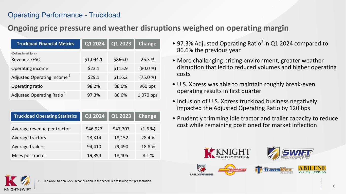 4 $1,094.1M $29.1M 97.3% ~16,600 irregular route and ~6,700 dedicated tractors $241.0M $24.2M 90.0% 122 Service Centers 4,692 terminal door count $126.7M $3.6M 97.1% Gross Margin 16.8% $88.0M ($4.9M) 105.6% 609 tractors 12,582 containers 1 See GAAP to non-GAAP reconciliation in the schedules following this presentation 2 Excludes Trucking and LTL fuel Surcharge and intersegment transactions Q1 2024 Revenue Diversification Q1 2024 Segment Overview LTL segment provides income stability while Truckload navigates challenging market OTR 47% / Dedicated 20% LTL 15% Truckload 67% Log isti cs 8% Intermodal 5% Other 5% Revenue xFSC2 Adjusted Op Income1 Adjusted OR1 Truckload Less-than- Truckload Logistics Intermodal KNX $1.6B2