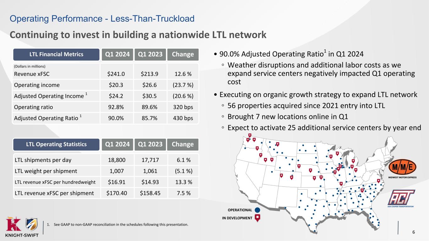 5 (Dollars in millions) Revenue xFSC $1,094.1 $866.0 26.3 % Operating income $23.1 $115.9 (80.0 %) Adjusted Operating Income 1 $29.1 $116.2 (75.0 %) Operating ratio 98.2% 88.6% 960 bps Adjusted Operating Ratio 1 97.3% 86.6% 1,070 bps Truckload Financial Metrics • 97.3% Adjusted Operating Ratio1 in Q1 2024 compared to 86.6% the previous year • More challenging pricing environment, greater weather disruption that led to reduced volumes and higher operating costs • U.S. Xpress was able to maintain roughly break-even operating results in first quarter • Inclusion of U.S. Xpress truckload business negatively impacted the Adjusted Operating Ratio by 120 bps • Prudently trimming idle tractor and trailer capacity to reduce cost while remaining positioned for market inflection 1 See GAAP to non-GAAP reconciliation in the schedules following this presentation. Average revenue per tractor $46,927 $47,707 (1.6 %) Average tractors 23,314 18,152 28.4 % Average trailers 94,410 79,490 18.8 % Miles per tractor 19,894 18,405 8.1 % Operating Performance - Truckload Ongoing price pressure and weather disruptions weighed on operating margin Q1 2024 Q1 2023 Change Truckload Operating Statistics Q1 2024 Q1 2023 Change