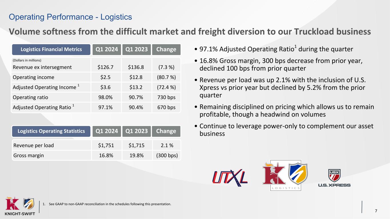 6 • 90.0% Adjusted Operating Ratio1 in Q1 2024 ◦ Weather disruptions and additional labor costs as we expand service centers negatively impacted Q1 operating cost • Executing on organic growth strategy to expand LTL network ◦ 56 properties acquired since 2021 entry into LTL ◦ Brought 7 new locations online in Q1 ◦ Expect to activate 25 additional service centers by year end Operating Performance - Less-Than-Truckload Continuing to invest in building a nationwide LTL network 1. See GAAP to non-GAAP reconciliation in the schedules following this presentation. (Dollars in millions) Revenue xFSC $241.0 $213.9 12.6 % Operating income $20.3 $26.6 (23.7 %) Adjusted Operating Income 1 $24.2 $30.5 (20.6 %) Operating ratio 92.8% 89.6% 320 bps Adjusted Operating Ratio 1 90.0% 85.7% 430 bps LTL Financial Metrics Q1 2024 Q1 2023 Change LTL shipments per day 18,800 17,717 6.1 % LTL weight per shipment 1,007 1,061 (5.1 %) LTL revenue xFSC per hundredweight $16.91 $14.93 13.3 % LTL revenue xFSC per shipment $170.40 $158.45 7.5 % LTL Operating Statistics Q1 2024 Q1 2023 Change OPERATIONAL IN DEVELOPMENT