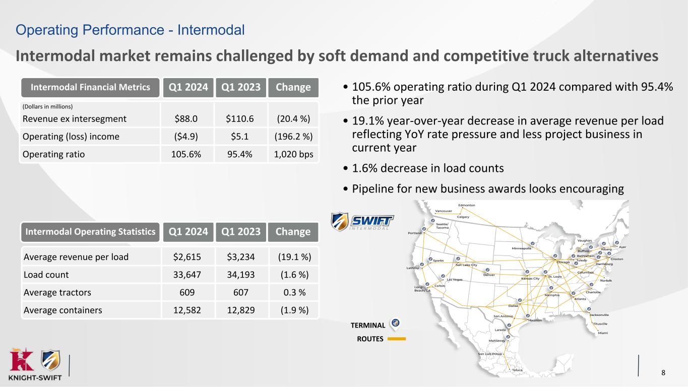 7 • 97.1% Adjusted Operating Ratio1 during the quarter • 16.8% Gross margin, 300 bps decrease from prior year, declined 100 bps from prior quarter • Revenue per load was up 2.1% with the inclusion of U.S. Xpress vs prior year but declined by 5.2% from the prior quarter • Remaining disciplined on pricing which allows us to remain profitable, though a headwind on volumes • Continue to leverage power-only to complement our asset business Operating Performance - Logistics Volume softness from the difficult market and freight diversion to our Truckload business 1. See GAAP to non-GAAP reconciliation in the schedules following this presentation. (Dollars in millions) Revenue ex intersegment $126.7 $136.8 (7.3 %) Operating income $2.5 $12.8 (80.7 %) Adjusted Operating Income 1 $3.6 $13.2 (72.4 %) Operating ratio 98.0% 90.7% 730 bps Adjusted Operating Ratio 1 97.1% 90.4% 670 bps Logistics Financial Metrics Q1 2024 Q1 2023 Change Revenue per load $1,751 $1,715 2.1 % Gross margin 16.8% 19.8% (300 bps) Logistics Operating Statistics Q1 2024 Q1 2023 Change