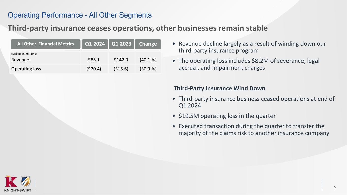 8 • 105.6% operating ratio during Q1 2024 compared with 95.4% the prior year • 19.1% year-over-year decrease in average revenue per load reflecting YoY rate pressure and less project business in current year • 1.6% decrease in load counts • Pipeline for new business awards looks encouraging Operating Performance - Intermodal Intermodal market remains challenged by soft demand and competitive truck alternatives (Dollars in millions) Revenue ex intersegment $88.0 $110.6 (20.4 %) Operating (loss) income ($4.9) $5.1 (196.2 %) Operating ratio 105.6% 95.4% 1,020 bps Intermodal Financial Metrics Q1 2024 Q1 2023 Change Average revenue per load $2,615 $3,234 (19.1 %) Load count 33,647 34,193 (1.6 %) Average tractors 609 607 0.3 % Average containers 12,582 12,829 (1.9 %) Intermodal Operating Statistics Q1 2024 Q1 2023 Change ROUTES TERMINAL