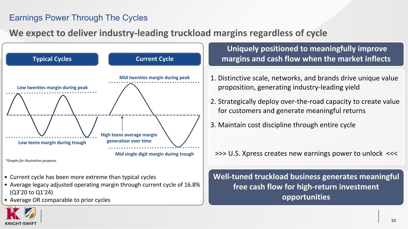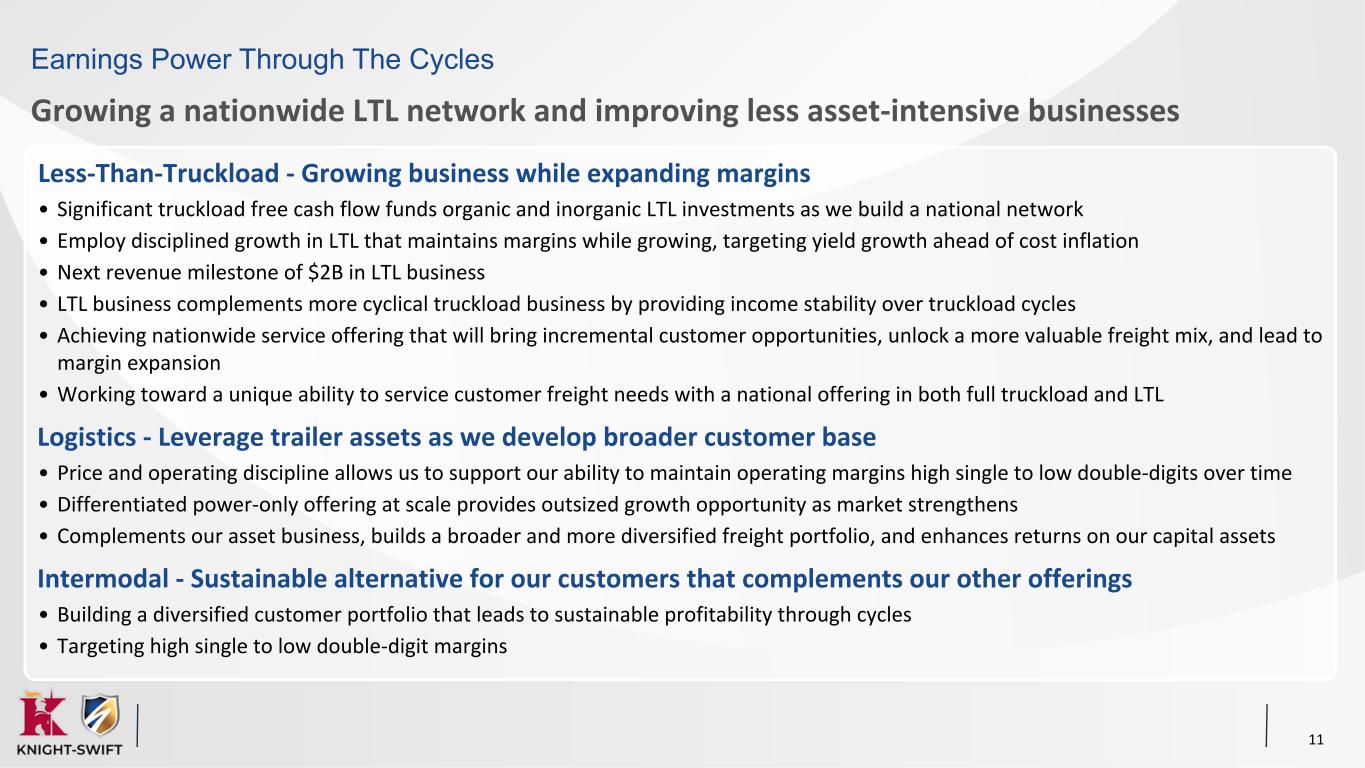 10 Earnings Power Through The Cycles We expect to deliver industry-leading truckload margins regardless of cycle Low twenties margin during peak Low teens margin during trough Mid twenties margin during peak Mid single digit margin during trough 1. Distinctive scale, networks, and brands drive unique value proposition, generating industry-leading yield 2. Strategically deploy over-the-road capacity to create value for customers and generate meaningful returns 3. Maintain cost discipline through entire cycle >>> U.S. Xpress creates new earnings power to unlock <<< Typical Cycles Current Cycle Uniquely positioned to meaningfully improve margins and cash flow when the market inflects High teens average margin generation over time • Current cycle has been more extreme than typical cycles • Average legacy adjusted operating margin through current cycle of 16.8% (Q3'20 to Q1'24) • Average OR comparable to prior cycles Well-tuned truckload business generates meaningful free cash flow for high-return investment opportunities *Graphs for illustration purposes