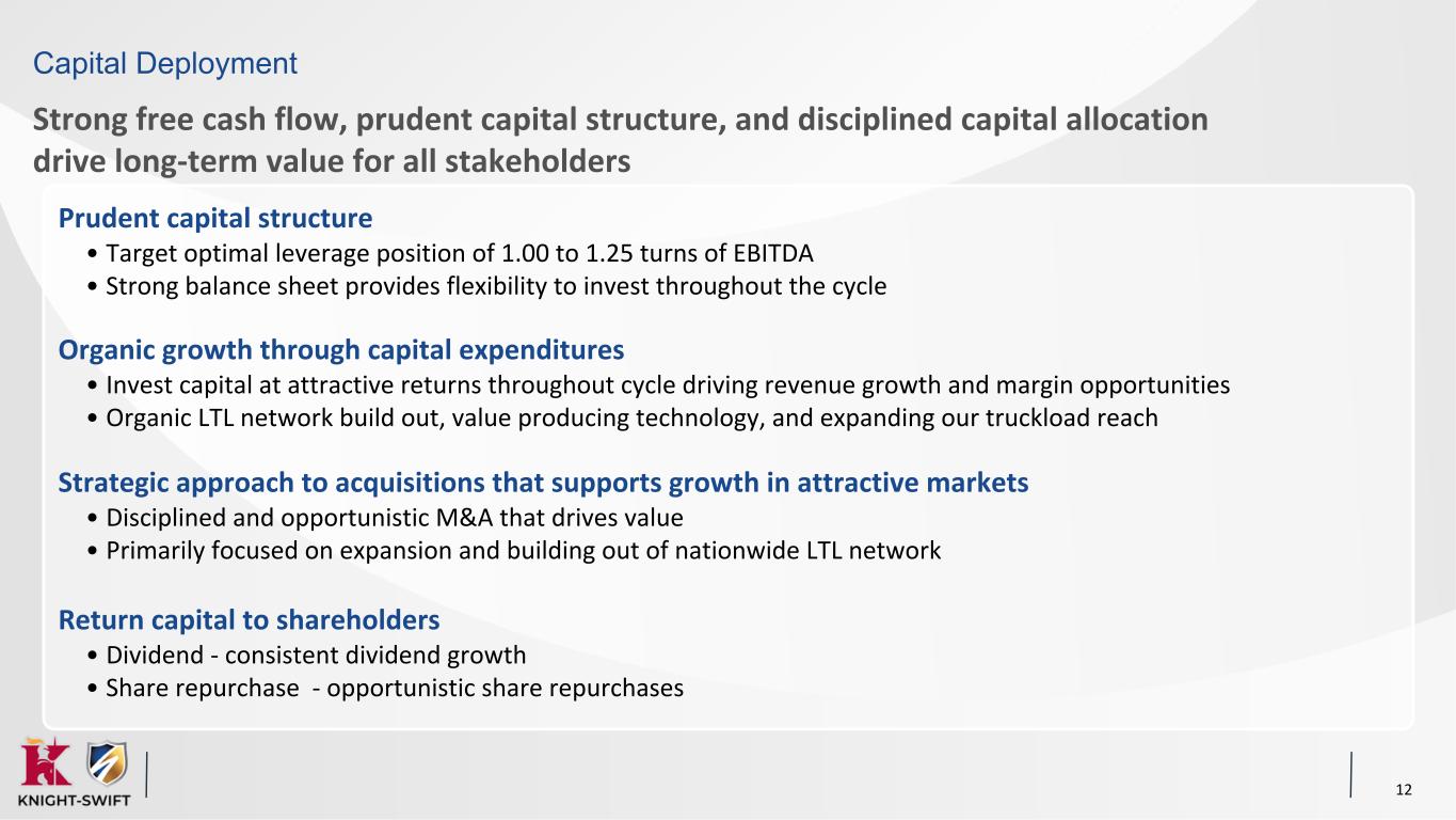 11 Earnings Power Through The Cycles Growing a nationwide LTL network and improving less asset-intensive businesses Less-Than-Truckload - Growing business while expanding margins • Significant truckload free cash flow funds organic and inorganic LTL investments as we build a national network • Employ disciplined growth in LTL that maintains margins while growing, targeting yield growth ahead of cost inflation • Next revenue milestone of $2B in LTL business • LTL business complements more cyclical truckload business by providing income stability over truckload cycles • Achieving nationwide service offering that will bring incremental customer opportunities, unlock a more valuable freight mix, and lead to margin expansion • Working toward a unique ability to service customer freight needs with a national offering in both full truckload and LTL Logistics - Leverage trailer assets as we develop broader customer base • Price and operating discipline allows us to support our ability to maintain operating margins high single to low double-digits over time • Differentiated power-only offering at scale provides outsized growth opportunity as market strengthens • Complements our asset business, builds a broader and more diversified freight portfolio, and enhances returns on our capital assets Intermodal - Sustainable alternative for our customers that complements our other offerings • Building a diversified customer portfolio that leads to sustainable profitability through cycles • Targeting high single to low double-digit margins