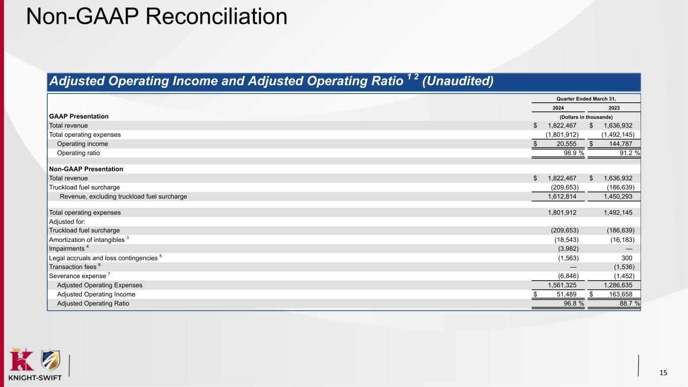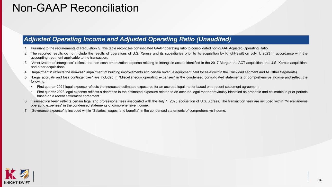 15 Adjusted Operating Income and Adjusted Operating Ratio 1 2 (Unaudited) Quarter Ended March 31, 2024 2023 GAAP Presentation (Dollars in thousands) Total revenue $ 1,822,467 $ 1,636,932 Total operating expenses (1,801,912) (1,492,145) Operating income $ 20,555 $ 144,787 Operating ratio 98.9 % 91.2 % Non-GAAP Presentation Total revenue $ 1,822,467 $ 1,636,932 Truckload fuel surcharge (209,653) (186,639) Revenue, excluding truckload fuel surcharge 1,612,814 1,450,293 Total operating expenses 1,801,912 1,492,145 Adjusted for: Truckload fuel surcharge (209,653) (186,639) Amortization of intangibles 3 (18,543) (16,183) Impairments 4 (3,982) — Legal accruals and loss contingencies 5 (1,563) 300 Transaction fees 6 — (1,536) Severance expense 7 (6,846) (1,452) Adjusted Operating Expenses 1,561,325 1,286,635 Adjusted Operating Income $ 51,489 $ 163,658 Adjusted Operating Ratio 96.8 % 88.7 % Non-GAAP Reconciliation