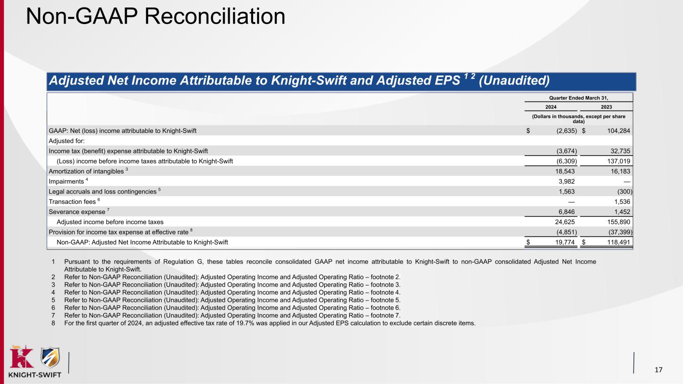 16 Adjusted Operating Income and Adjusted Operating Ratio (Unaudited) 1 Pursuant to the requirements of Regulation G, this table reconciles consolidated GAAP operating ratio to consolidated non-GAAP Adjusted Operating Ratio. 2 The reported results do not include the results of operations of U.S. Xpress and its subsidiaries prior to its acquisition by Knight-Swift on July 1, 2023 in accordance with the accounting treatment applicable to the transaction. 3 "Amortization of intangibles" reflects the non-cash amortization expense relating to intangible assets identified in the 2017 Merger, the ACT acquisition, the U.S. Xpress acquisition, and other acquisitions. 4 "Impairments" reflects the non-cash impairment of building improvements and certain revenue equipment held for sale (within the Truckload segment and All Other Segments). 5 "Legal accruals and loss contingencies" are included in "Miscellaneous operating expenses" in the condensed consolidated statements of comprehensive income and reflect the following: • First quarter 2024 legal expense reflects the increased estimated exposures for an accrued legal matter based on a recent settlement agreement. • First quarter 2023 legal expense reflects a decrease in the estimated exposure related to an accrued legal matter previously identified as probable and estimable in prior periods based on a recent settlement agreement. 6 "Transaction fees" reflects certain legal and professional fees associated with the July 1, 2023 acquisition of U.S. Xpress. The transaction fees are included within "Miscellaneous operating expenses" in the condensed statements of comprehensive income. 7 "Severance expense" is included within "Salaries, wages, and benefits" in the condensed statements of comprehensive income. Non-GAAP Reconciliation