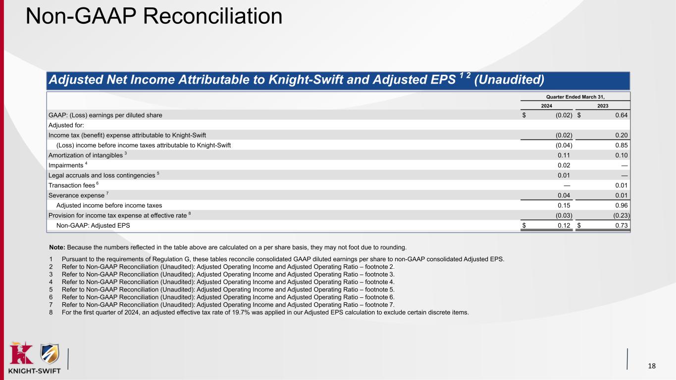 17 Adjusted Net Income Attributable to Knight-Swift and Adjusted EPS 1 2 (Unaudited) Quarter Ended March 31, 2024 2023 (Dollars in thousands, except per share data) GAAP: Net (loss) income attributable to Knight-Swift $ (2,635) $ 104,284 Adjusted for: Income tax (benefit) expense attributable to Knight-Swift (3,674) 32,735 (Loss) income before income taxes attributable to Knight-Swift (6,309) 137,019 Amortization of intangibles 3 18,543 16,183 Impairments 4 3,982 — Legal accruals and loss contingencies 5 1,563 (300) Transaction fees 6 — 1,536 Severance expense 7 6,846 1,452 Adjusted income before income taxes 24,625 155,890 Provision for income tax expense at effective rate 8 (4,851) (37,399) Non-GAAP: Adjusted Net Income Attributable to Knight-Swift $ 19,774 $ 118,491 1 Pursuant to the requirements of Regulation G, these tables reconcile consolidated GAAP net income attributable to Knight-Swift to non-GAAP consolidated Adjusted Net Income Attributable to Knight-Swift. 2 Refer to Non-GAAP Reconciliation (Unaudited): Adjusted Operating Income and Adjusted Operating Ratio – footnote 2. 3 Refer to Non-GAAP Reconciliation (Unaudited): Adjusted Operating Income and Adjusted Operating Ratio – footnote 3. 4 Refer to Non-GAAP Reconciliation (Unaudited): Adjusted Operating Income and Adjusted Operating Ratio – footnote 4. 5 Refer to Non-GAAP Reconciliation (Unaudited): Adjusted Operating Income and Adjusted Operating Ratio – footnote 5. 6 Refer to Non-GAAP Reconciliation (Unaudited): Adjusted Operating Income and Adjusted Operating Ratio – footnote 6. 7 Refer to Non-GAAP Reconciliation (Unaudited): Adjusted Operating Income and Adjusted Operating Ratio – footnote 7. 8 For the first quarter of 2024, an adjusted effective tax rate of 19.7% was applied in our Adjusted EPS calculation to exclude certain discrete items. Non-GAAP Reconciliation