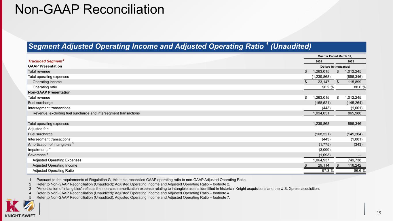 18 Adjusted Net Income Attributable to Knight-Swift and Adjusted EPS 1 2 (Unaudited) Quarter Ended March 31, 2024 2023 GAAP: (Loss) earnings per diluted share $ (0.02) $ 0.64 Adjusted for: Income tax (benefit) expense attributable to Knight-Swift (0.02) 0.20 (Loss) income before income taxes attributable to Knight-Swift (0.04) 0.85 Amortization of intangibles 3 0.11 0.10 Impairments 4 0.02 — Legal accruals and loss contingencies 5 0.01 — Transaction fees 6 — 0.01 Severance expense 7 0.04 0.01 Adjusted income before income taxes 0.15 0.96 Provision for income tax expense at effective rate 8 (0.03) (0.23) Non-GAAP: Adjusted EPS $ 0.12 $ 0.73 Note: Because the numbers reflected in the table above are calculated on a per share basis, they may not foot due to rounding. 1 Pursuant to the requirements of Regulation G, these tables reconcile consolidated GAAP diluted earnings per share to non-GAAP consolidated Adjusted EPS. 2 Refer to Non-GAAP Reconciliation (Unaudited): Adjusted Operating Income and Adjusted Operating Ratio – footnote 2. 3 Refer to Non-GAAP Reconciliation (Unaudited): Adjusted Operating Income and Adjusted Operating Ratio – footnote 3. 4 Refer to Non-GAAP Reconciliation (Unaudited): Adjusted Operating Income and Adjusted Operating Ratio – footnote 4. 5 Refer to Non-GAAP Reconciliation (Unaudited): Adjusted Operating Income and Adjusted Operating Ratio – footnote 5. 6 Refer to Non-GAAP Reconciliation (Unaudited): Adjusted Operating Income and Adjusted Operating Ratio – footnote 6. 7 Refer to Non-GAAP Reconciliation (Unaudited): Adjusted Operating Income and Adjusted Operating Ratio – footnote 7. 8 For the first quarter of 2024, an adjusted effective tax rate of 19.7% was applied in our Adjusted EPS calculation to exclude certain discrete items. Non-GAAP Reconciliation