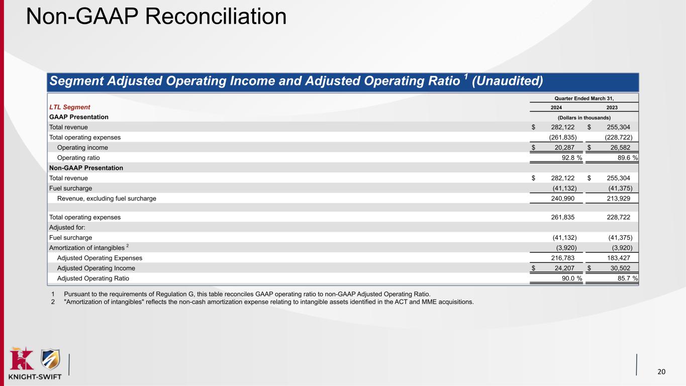 19 Segment Adjusted Operating Income and Adjusted Operating Ratio 1 (Unaudited) Quarter Ended March 31, Truckload Segment 2 2024 2023 GAAP Presentation (Dollars in thousands) Total revenue $ 1,263,015 $ 1,012,245 Total operating expenses (1,239,868) (896,346) Operating income $ 23,147 $ 115,899 Operating ratio 98.2 % 88.6 % Non-GAAP Presentation Total revenue $ 1,263,015 $ 1,012,245 Fuel surcharge (168,521) (145,264) Intersegment transactions (443) (1,001) Revenue, excluding fuel surcharge and intersegment transactions 1,094,051 865,980 Total operating expenses 1,239,868 896,346 Adjusted for: Fuel surcharge (168,521) (145,264) Intersegment transactions (443) (1,001) Amortization of intangibles 3 (1,775) (343) Impairments 4 (3,099) — Severance 5 (1,093) — Adjusted Operating Expenses 1,064,937 749,738 Adjusted Operating Income $ 29,114 $ 116,242 Adjusted Operating Ratio 97.3 % 86.6 % 1 Pursuant to the requirements of Regulation G, this table reconciles GAAP operating ratio to non-GAAP Adjusted Operating Ratio. 2 Refer to Non-GAAP Reconciliation (Unaudited): Adjusted Operating Income and Adjusted Operating Ratio – footnote 2. 3 "Amortization of intangibles" reflects the non-cash amortization expense relating to intangible assets identified in historical Knight acquisitions and the U.S. Xpress acquisition. 4 Refer to Non-GAAP Reconciliation (Unaudited): Adjusted Operating Income and Adjusted Operating Ratio – footnote 4. 5 Refer to Non-GAAP Reconciliation (Unaudited): Adjusted Operating Income and Adjusted Operating Ratio – footnote 7. Non-GAAP Reconciliation