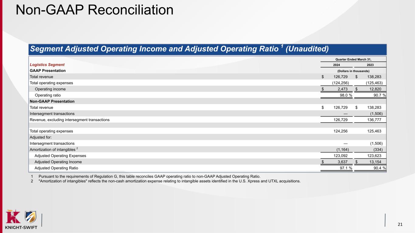 20 Segment Adjusted Operating Income and Adjusted Operating Ratio 1 (Unaudited) Quarter Ended March 31, LTL Segment 2024 2023 GAAP Presentation (Dollars in thousands) Total revenue $ 282,122 $ 255,304 Total operating expenses (261,835) (228,722) Operating income $ 20,287 $ 26,582 Operating ratio 92.8 % 89.6 % Non-GAAP Presentation Total revenue $ 282,122 $ 255,304 Fuel surcharge (41,132) (41,375) Revenue, excluding fuel surcharge 240,990 213,929 Total operating expenses 261,835 228,722 Adjusted for: Fuel surcharge (41,132) (41,375) Amortization of intangibles 2 (3,920) (3,920) Adjusted Operating Expenses 216,783 183,427 Adjusted Operating Income $ 24,207 $ 30,502 Adjusted Operating Ratio 90.0 % 85.7 % 1 Pursuant to the requirements of Regulation G, this table reconciles GAAP operating ratio to non-GAAP Adjusted Operating Ratio. 2 "Amortization of intangibles" reflects the non-cash amortization expense relating to intangible assets identified in the ACT and MME acquisitions. Non-GAAP Reconciliation