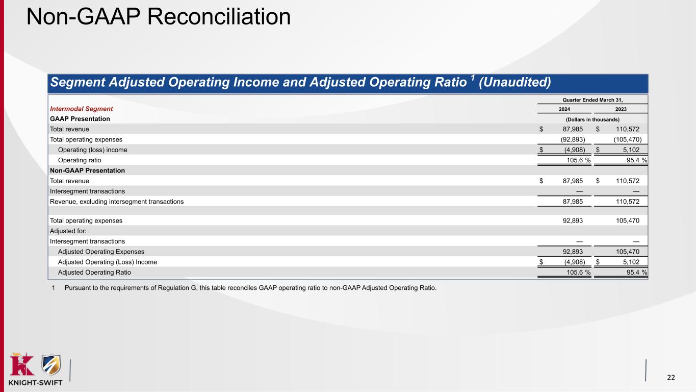 21 Quarter Ended March 31, Logistics Segment 2024 2023 GAAP Presentation (Dollars in thousands) Total revenue $ 126,729 $ 138,283 Total operating expenses (124,256) (125,463) Operating income $ 2,473 $ 12,820 Operating ratio 98.0 % 90.7 % Non-GAAP Presentation Total revenue $ 126,729 $ 138,283 Intersegment transactions — (1,506) Revenue, excluding intersegment transactions 126,729 136,777 Total operating expenses 124,256 125,463 Adjusted for: Intersegment transactions — (1,506) Amortization of intangibles 2 (1,164) (334) Adjusted Operating Expenses 123,092 123,623 Adjusted Operating Income $ 3,637 $ 13,154 Adjusted Operating Ratio 97.1 % 90.4 % Segment Adjusted Operating Income and Adjusted Operating Ratio 1 (Unaudited) 1 Pursuant to the requirements of Regulation G, this table reconciles GAAP operating ratio to non-GAAP Adjusted Operating Ratio. 2 "Amortization of intangibles" reflects the non-cash amortization expense relating to intangible assets identified in the U.S. Xpress and UTXL acquisitions. Non-GAAP Reconciliation