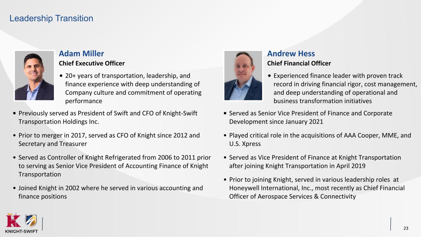 23 Leadership Transition Adam Miller Chief Executive Officer • 20+ years of transportation, leadership, and finance experience with deep understanding of Company culture and commitment of operating performance • Previously served as President of Swift and CFO of Knight-Swift Transportation Holdings Inc. • Prior to merger in 2017, served as CFO of Knight since 2012 and Secretary and Treasurer • Served as Controller of Knight Refrigerated from 2006 to 2011 prior to serving as Senior Vice President of Accounting Finance of Knight Transportation • Joined Knight in 2002 where he served in various accounting and finance positions Andrew Hess Chief Financial Officer • Experienced finance leader with proven track record in driving financial rigor, cost management, and deep understanding of operational and business transformation initiatives • Served as Senior Vice President of Finance and Corporate Development since January 2021 • Played critical role in the acquisitions of AAA Cooper, MME, and U.S. Xpress • Served as Vice President of Finance at Knight Transportation after joining Knight Transportation in April 2019 • Prior to joining Knight, served in various leadership roles at Honeywell International, Inc., most recently as Chief Financial Officer of Aerospace Services & Connectivity