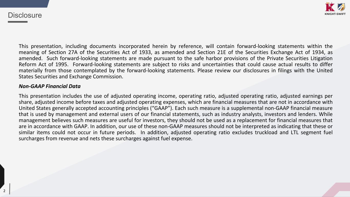 2 This presentation, including documents incorporated herein by reference, will contain forward-looking statements within the meaning of Section 27A of the Securities Act of 1933, as amended and Section 21E of the Securities Exchange Act of 1934, as amended. Such forward-looking statements are made pursuant to the safe harbor provisions of the Private Securities Litigation Reform Act of 1995. Forward-looking statements are subject to risks and uncertainties that could cause actual results to differ materially from those contemplated by the forward-looking statements. Please review our disclosures in filings with the United States Securities and Exchange Commission. Non-GAAP Financial Data This presentation includes the use of adjusted operating income, operating ratio, adjusted operating ratio, adjusted earnings per share, adjusted income before taxes and adjusted operating expenses, which are financial measures that are not in accordance with United States generally accepted accounting principles (“GAAP”). Each such measure is a supplemental non-GAAP financial measure that is used by management and external users of our financial statements, such as industry analysts, investors and lenders. While management believes such measures are useful for investors, they should not be used as a replacement for financial measures that are in accordance with GAAP. In addition, our use of these non-GAAP measures should not be interpreted as indicating that these or similar items could not occur in future periods. In addition, adjusted operating ratio excludes truckload and LTL segment fuel surcharges from revenue and nets these surcharges against fuel expense. Disclosure
