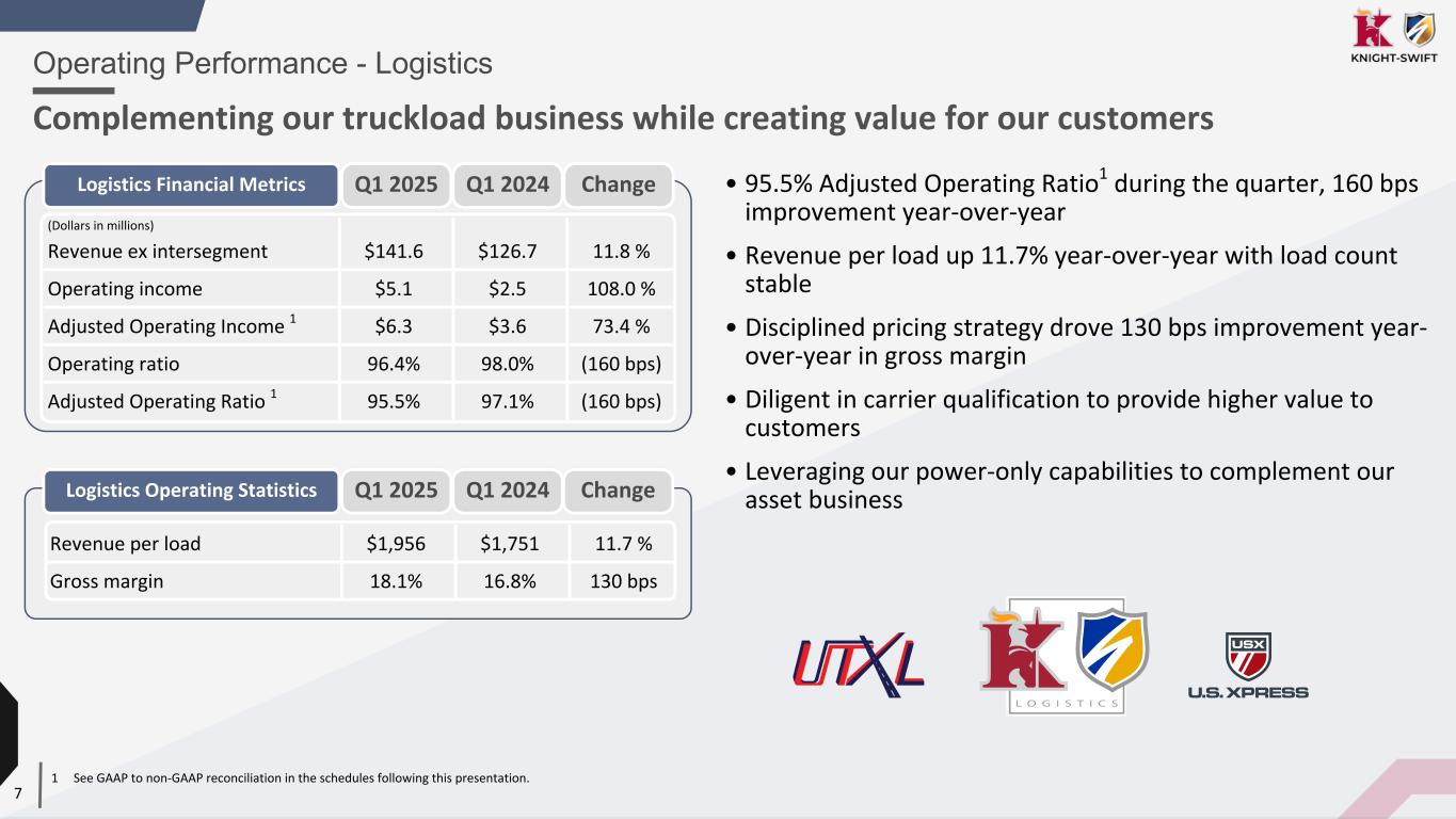 6 Three Brands One Network One Operating System LTL shipments per day 23,349 18,800 24.2 % LTL weight per shipment 982 1,007 (2.5 %) LTL revenue xFSC per hundredweight $18.48 $16.91 9.3 % LTL revenue xFSC per shipment $181.52 $170.40 6.5 % Operating Performance - Less-Than-Truckload Expanded network creating new opportunities and leading to strong shipment growth (Dollars in millions) Revenue xFSC $305.3 $241.0 26.7 % Operating income $12.7 $20.3 (37.4 %) Adjusted Operating Income 1 $17.7 $24.2 (26.9 %) Operating ratio 96.4% 92.8% 360 bps Adjusted Operating Ratio 1 94.2% 90.0% 420 bps LTL Financial Metrics LTL Operating Statistics 1 See GAAP to non-GAAP reconciliation in the schedules following this presentation. ACT, MME, and DHE Locations Locations Added in Q1 2025 • Revenue xFSC increased 26.7% year-over-year driven by 24.2% shipment growth and 9.3% year-over-year increase in LTL Revenue xFSC per hundredweight • Added 7 locations and over 200 doors in Q1, continued expansion expected in 2025 at a slower pace than 2024 • Driving improved efficiencies in our expanded network Q1 2025 Q1 2024 Change Q1 2025 Q1 2024 Change