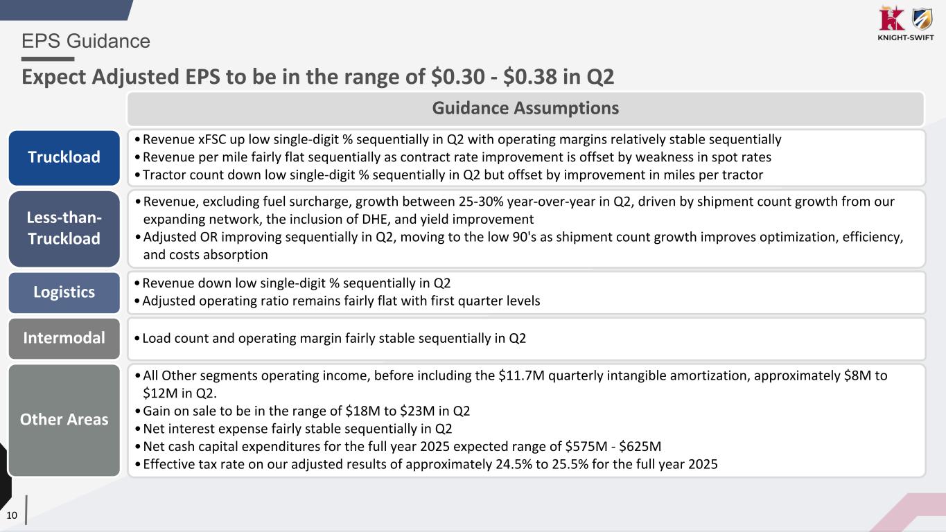 9 • Revenue decline largely as a result of winding down our third-party insurance program at the end of Q1 2024 • Operating profit of $6.0M in Q1, $26.5M higher year-over- year driven by our warehousing and trailer leasing businesses and prior year period $19.5M operating loss associated with the third-party insurance business • All Other Segments includes $11.7M in quarterly amortization of intangibles related to the 2017 merger with Knight and Swift and certain acquisitions Operating Performance - All Other Segments Trailer leasing and warehousing operations providing value to our customers (Dollars in millions) Revenue $71.6 $85.1 (15.9 %) Operating profit / (loss) $6.0 ($20.4) N/A All Other Financial Metrics Q1 2025 Q1 2024 Change