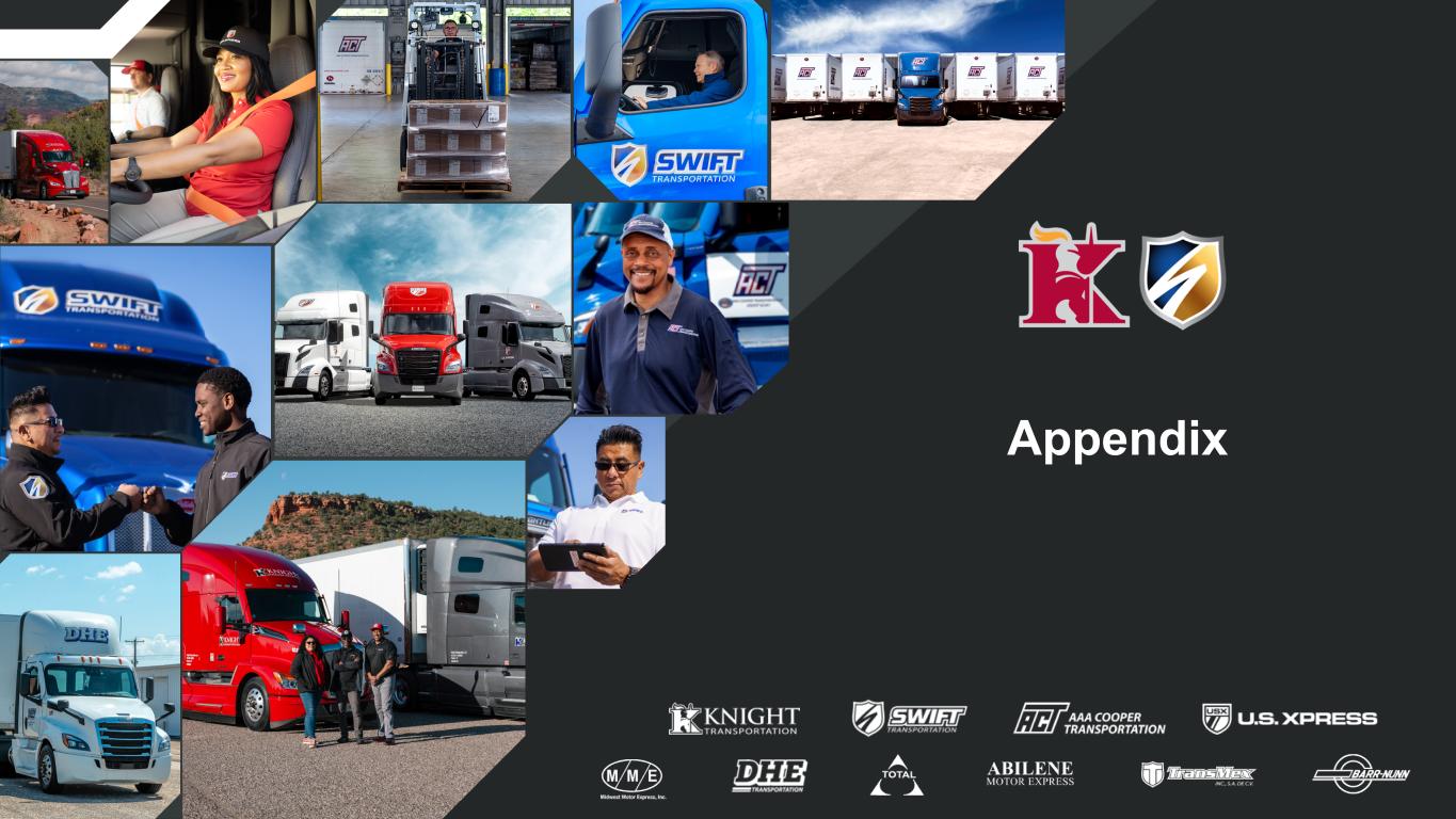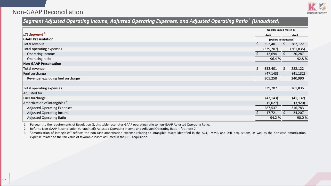 16 Segment Adjusted Operating Income, Adjusted Operating Expenses, and Adjusted Operating Ratio 1 (Unaudited) Quarter Ended March 31, Truckload Segment 2025 2024 GAAP Presentation (Dollars in thousands) Total revenue $ 1,192,550 $ 1,263,015 Total operating expenses (1,147,950) (1,239,868) Operating income $ 44,600 $ 23,147 Operating ratio 96.3 % 98.2 % Non-GAAP Presentation Total revenue $ 1,192,550 $ 1,263,015 Fuel surcharge (144,256) (168,521) Intersegment transactions (211) (443) Revenue, excluding fuel surcharge and intersegment transactions 1,048,083 1,094,051 Total operating expenses 1,147,950 1,239,868 Adjusted for: Fuel surcharge (144,256) (168,521) Intersegment transactions (211) (443) Amortization of intangibles 2 (1,775) (1,775) Impairments 3 (28) (3,099) Legal accruals 4 (82) — Severance 5 — (1,093) Adjusted Operating Expenses 1,001,598 1,064,937 Adjusted Operating Income $ 46,485 $ 29,114 Adjusted Operating Ratio 95.6 % 97.3 % 1 Pursuant to the requirements of Regulation G, this table reconciles GAAP operating ratio to non-GAAP Adjusted Operating Ratio. 2 "Amortization of intangibles" reflects the non-cash amortization expense relating to intangible assets identified in historical Knight acquisitions and the U.S. Xpress acquisition. 3 Refer to Non-GAAP Reconciliation (Unaudited): Adjusted Operating Income, Adjusted Operating Expenses, and Adjusted Operating Ratio – footnote 4. 4 Refer to Non-GAAP Reconciliation (Unaudited): Adjusted Operating Income, Adjusted Operating Expenses, and Adjusted Operating Ratio – footnote 5. 5 Refer to Non-GAAP Reconciliation (Unaudited): Adjusted Operating Income, Adjusted Operating Expenses, and Adjusted Operating Ratio – footnote 6. Non-GAAP Reconciliation