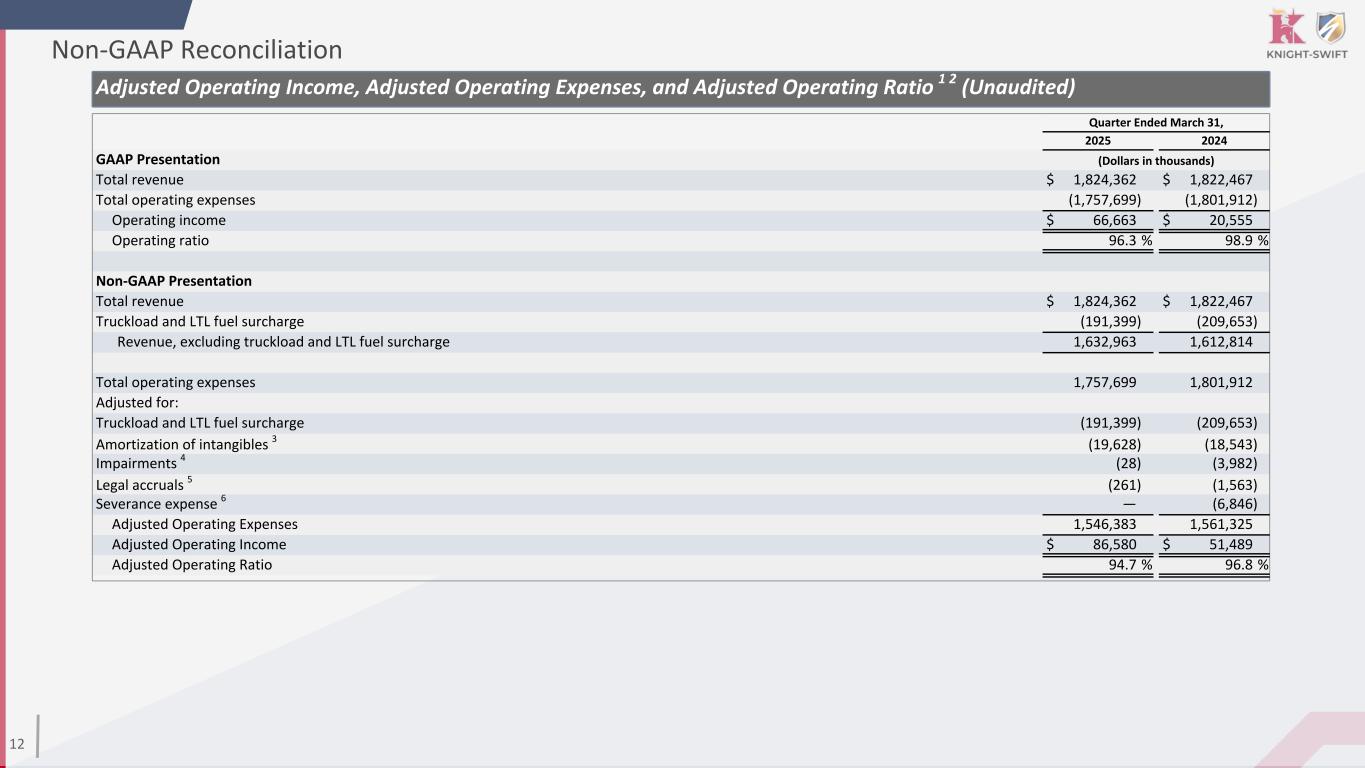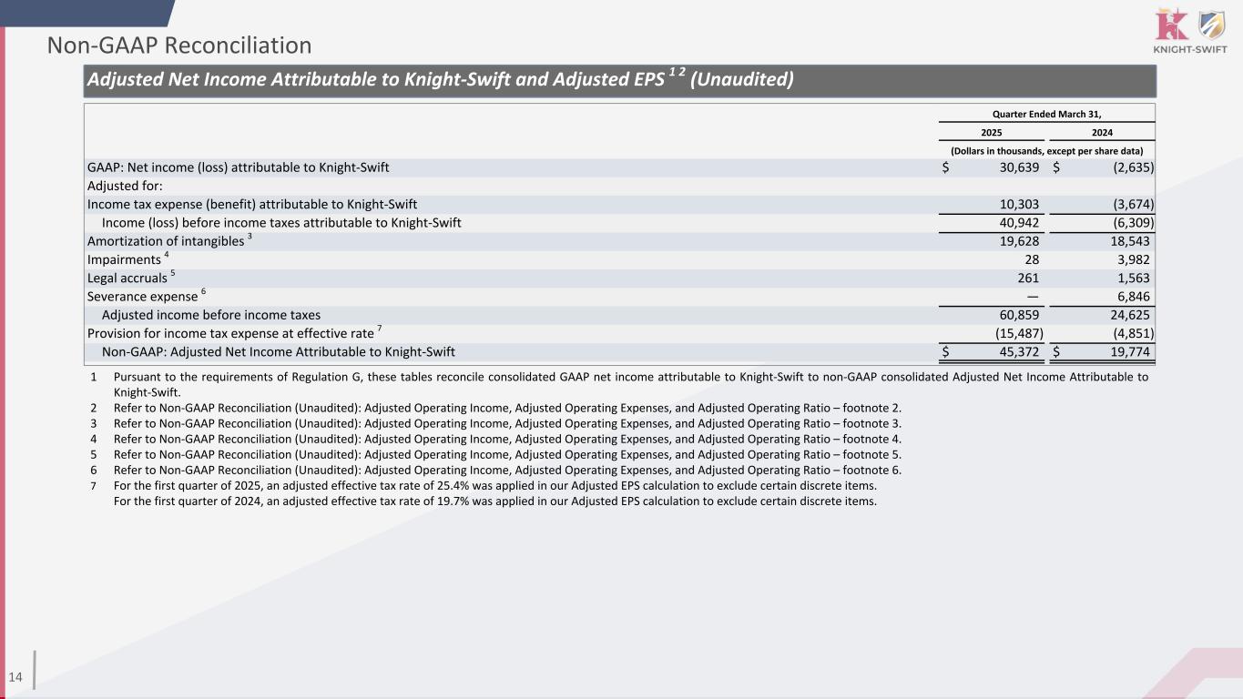 13 Adjusted Operating Income, Adjusted Operating Expenses, and Adjusted Operating Ratio (Unaudited) 1 Pursuant to the requirements of Regulation G, this table reconciles consolidated GAAP operating ratio to consolidated non-GAAP Adjusted Operating Ratio. 2 The reported results do not include the results of operations of the LTL division of DHE prior to its acquisition by Knight-Swift on July 30, 2024 in accordance with the accounting treatment applicable to the transaction. 3 "Amortization of intangibles" reflects the non-cash amortization expense relating to intangible assets identified in the 2017 Merger, the ACT acquisition, the U.S. Xpress acquisition, and other acquisitions, as well as the non-cash amortization expense related to the fair value of favorable leases assumed in the DHE acquisition included within "Rental expense" in the condensed consolidated statements of comprehensive income. 4 "Impairments" reflects the non-cash impairment: • First quarter 2025 reflects non-cash impairments related to certain real property leases (within the Truckload segment). • First quarter 2024 reflects the non-cash impairment of building improvements and certain revenue equipment held for sale (within the Truckload segment and All Other Segments). 5 "Legal accruals" are included in "Miscellaneous operating expenses" in the condensed consolidated statements of comprehensive income and reflect the following: • First quarter 2025 legal expense reflects the increased estimated exposure for accrued legal matters based on recent settlement agreements. • First quarter 2024 legal expense reflects the increased estimated exposures for an accrued legal matter based on a recent settlement agreement. 6 "Severance expense" is included within "Salaries, wages, and benefits" in the condensed statements of comprehensive income. Non-GAAP Reconciliation