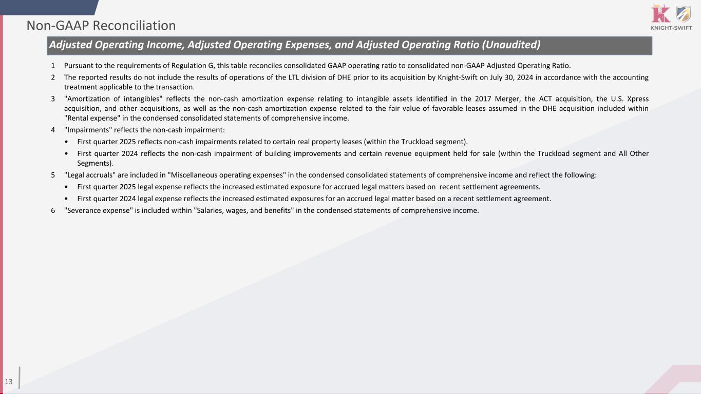 12 Adjusted Operating Income, Adjusted Operating Expenses, and Adjusted Operating Ratio 1 2 (Unaudited) Quarter Ended March 31, 2025 2024 GAAP Presentation (Dollars in thousands) Total revenue $ 1,824,362 $ 1,822,467 Total operating expenses (1,757,699) (1,801,912) Operating income $ 66,663 $ 20,555 Operating ratio 96.3 % 98.9 % Non-GAAP Presentation Total revenue $ 1,824,362 $ 1,822,467 Truckload and LTL fuel surcharge (191,399) (209,653) Revenue, excluding truckload and LTL fuel surcharge 1,632,963 1,612,814 Total operating expenses 1,757,699 1,801,912 Adjusted for: Truckload and LTL fuel surcharge (191,399) (209,653) Amortization of intangibles 3 (19,628) (18,543) Impairments 4 (28) (3,982) Legal accruals 5 (261) (1,563) Severance expense 6 — (6,846) Adjusted Operating Expenses 1,546,383 1,561,325 Adjusted Operating Income $ 86,580 $ 51,489 Adjusted Operating Ratio 94.7 % 96.8 % Non-GAAP Reconciliation