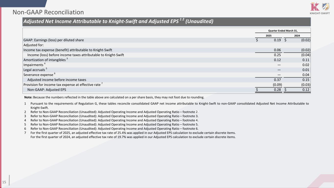 14 1 Pursuant to the requirements of Regulation G, these tables reconcile consolidated GAAP net income attributable to Knight-Swift to non-GAAP consolidated Adjusted Net Income Attributable to Knight-Swift. 2 Refer to Non-GAAP Reconciliation (Unaudited): Adjusted Operating Income, Adjusted Operating Expenses, and Adjusted Operating Ratio – footnote 2. 3 Refer to Non-GAAP Reconciliation (Unaudited): Adjusted Operating Income, Adjusted Operating Expenses, and Adjusted Operating Ratio – footnote 3. 4 Refer to Non-GAAP Reconciliation (Unaudited): Adjusted Operating Income, Adjusted Operating Expenses, and Adjusted Operating Ratio – footnote 4. 5 Refer to Non-GAAP Reconciliation (Unaudited): Adjusted Operating Income, Adjusted Operating Expenses, and Adjusted Operating Ratio – footnote 5. 6 Refer to Non-GAAP Reconciliation (Unaudited): Adjusted Operating Income, Adjusted Operating Expenses, and Adjusted Operating Ratio – footnote 6. 7 For the first quarter of 2025, an adjusted effective tax rate of 25.4% was applied in our Adjusted EPS calculation to exclude certain discrete items. For the first quarter of 2024, an adjusted effective tax rate of 19.7% was applied in our Adjusted EPS calculation to exclude certain discrete items. Adjusted Net Income Attributable to Knight-Swift and Adjusted EPS 1 2 (Unaudited) Quarter Ended March 31, 2025 2024 (Dollars in thousands, except per share data) GAAP: Net income (loss) attributable to Knight-Swift $ 30,639 $ (2,635) Adjusted for: Income tax expense (benefit) attributable to Knight-Swift 10,303 (3,674) Income (loss) before income taxes attributable to Knight-Swift 40,942 (6,309) Amortization of intangibles 3 19,628 18,543 Impairments 4 28 3,982 Legal accruals 5 261 1,563 Severance expense 6 — 6,846 Adjusted income before income taxes 60,859 24,625 Provision for income tax expense at effective rate 7 (15,487) (4,851) Non-GAAP: Adjusted Net Income Attributable to Knight-Swift $ 45,372 $ 19,774 Non-GAAP Reconciliation
