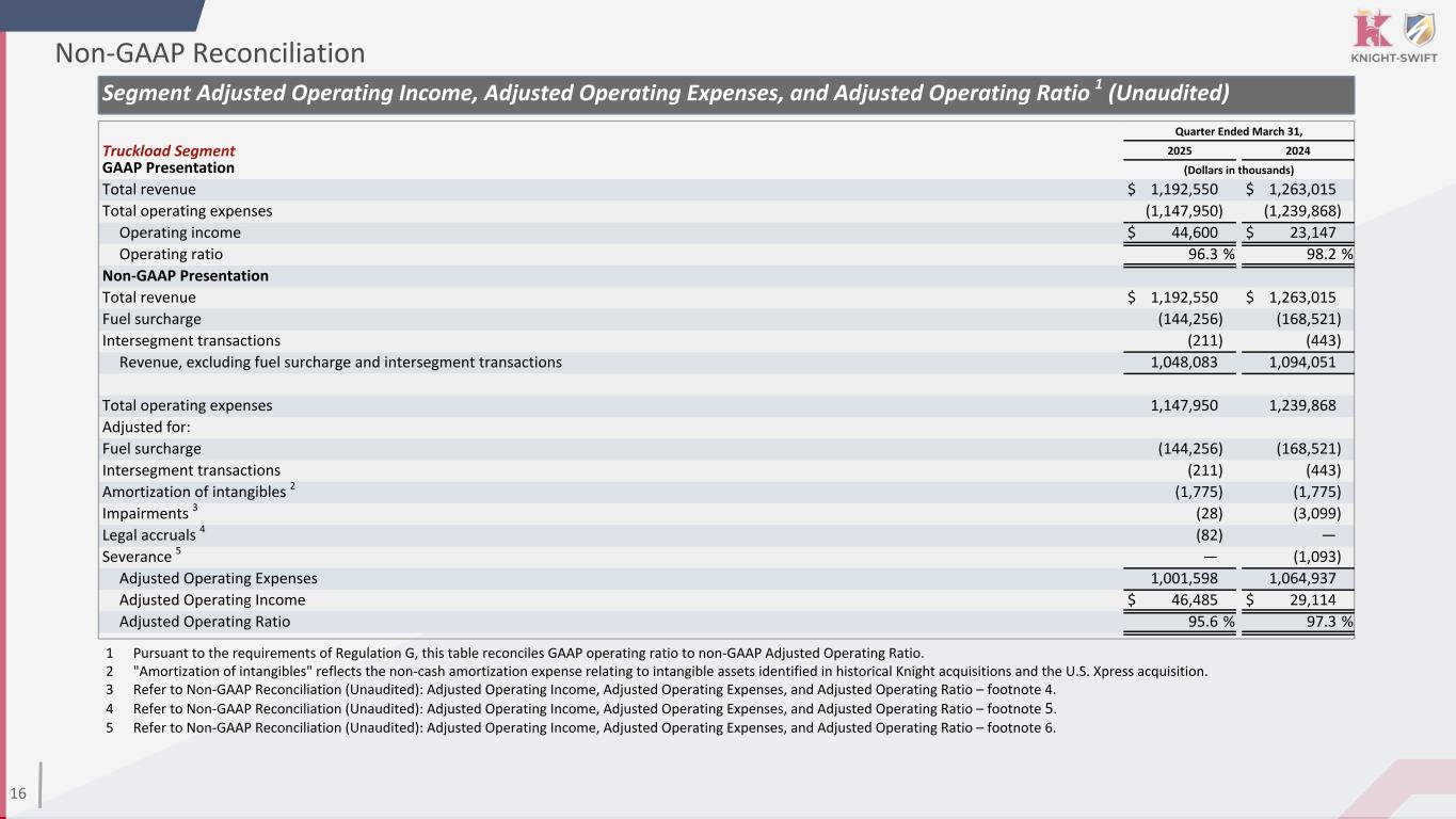 15 Adjusted Net Income Attributable to Knight-Swift and Adjusted EPS 1 2 (Unaudited) Quarter Ended March 31, 2025 2024 GAAP: Earnings (loss) per diluted share $ 0.19 $ (0.02) Adjusted for: Income tax expense (benefit) attributable to Knight-Swift 0.06 (0.02) Income (loss) before income taxes attributable to Knight-Swift 0.25 (0.04) Amortization of intangibles 3 0.12 0.11 Impairments 4 — 0.02 Legal accruals 5 — 0.01 Severance expense 6 — 0.04 Adjusted income before income taxes 0.37 0.15 Provision for income tax expense at effective rate 7 (0.09) (0.03) Non-GAAP: Adjusted EPS $ 0.28 $ 0.12 Note: Because the numbers reflected in the table above are calculated on a per share basis, they may not foot due to rounding. 1 Pursuant to the requirements of Regulation G, these tables reconcile consolidated GAAP net income attributable to Knight-Swift to non-GAAP consolidated Adjusted Net Income Attributable to Knight-Swift. 2 Refer to Non-GAAP Reconciliation (Unaudited): Adjusted Operating Income and Adjusted Operating Ratio – footnote 2. 3 Refer to Non-GAAP Reconciliation (Unaudited): Adjusted Operating Income and Adjusted Operating Ratio – footnote 3. 4 Refer to Non-GAAP Reconciliation (Unaudited): Adjusted Operating Income and Adjusted Operating Ratio – footnote 4. 5 Refer to Non-GAAP Reconciliation (Unaudited): Adjusted Operating Income and Adjusted Operating Ratio – footnote 5. 6 Refer to Non-GAAP Reconciliation (Unaudited): Adjusted Operating Income and Adjusted Operating Ratio – footnote 6. 7 For the first quarter of 2025, an adjusted effective tax rate of 25.4% was applied in our Adjusted EPS calculation to exclude certain discrete items. For the first quarter of 2024, an adjusted effective tax rate of 19.7% was applied in our Adjusted EPS calculation to exclude certain discrete items. djusted Net Income Attributable to Knight-Swift and Adjusted EPS 1 2 (Unaudited) Non-GAAP Reconciliation