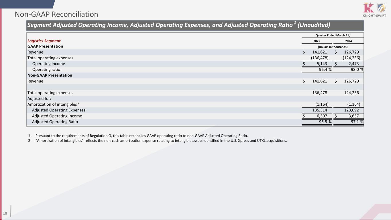 17 Segment Adjusted Operating Income, Adjusted Operating Expenses, and Adjusted Operating Ratio 1 (Unaudited) Quarter Ended March 31, LTL Segment 2 2025 2024 GAAP Presentation (Dollars in thousands) Total revenue $ 352,401 $ 282,122 Total operating expenses (339,707) (261,835) Operating income $ 12,694 $ 20,287 Operating ratio 96.4 % 92.8 % Non-GAAP Presentation Total revenue $ 352,401 $ 282,122 Fuel surcharge (47,143) (41,132) Revenue, excluding fuel surcharge 305,258 240,990 Total operating expenses 339,707 261,835 Adjusted for: Fuel surcharge (47,143) (41,132) Amortization of intangibles 3 (5,027) (3,920) Adjusted Operating Expenses 287,537 216,783 Adjusted Operating Income $ 17,721 $ 24,207 Adjusted Operating Ratio 94.2 % 90.0 % 1 Pursuant to the requirements of Regulation G, this table reconciles GAAP operating ratio to non-GAAP Adjusted Operating Ratio. 2 Refer to Non-GAAP Reconciliation (Unaudited): Adjusted Operating Income and Adjusted Operating Ratio – footnote 2. 3 "Amortization of intangibles" reflects the non-cash amortization expense relating to intangible assets identified in the ACT, MME, and DHE acquisitions, as well as the non-cash amortization expense related to the fair value of favorable leases assumed in the DHE acquisition. Non-GAAP Reconciliation