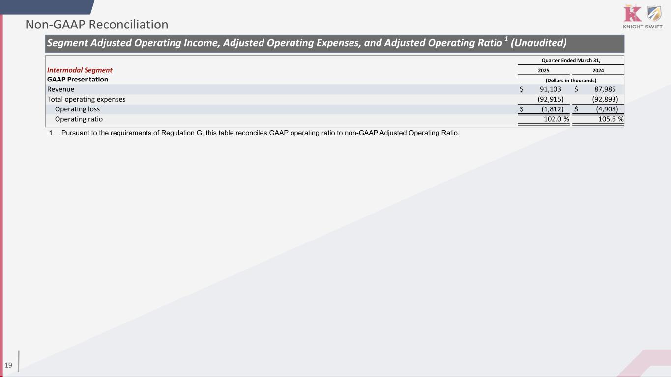 18 Quarter Ended March 31, Logistics Segment 2025 2024 GAAP Presentation (Dollars in thousands) Revenue $ 141,621 $ 126,729 Total operating expenses (136,478) (124,256) Operating income $ 5,143 $ 2,473 Operating ratio 96.4 % 98.0 % Non-GAAP Presentation Revenue $ 141,621 $ 126,729 Total operating expenses 136,478 124,256 Adjusted for: Amortization of intangibles 2 (1,164) (1,164) Adjusted Operating Expenses 135,314 123,092 Adjusted Operating Income $ 6,307 $ 3,637 Adjusted Operating Ratio 95.5 % 97.1 % Segment Adjusted Operating Income, Adjusted Operating Expenses, and Adjusted Operating Ratio 1 (Unaudited) 1 Pursuant to the requirements of Regulation G, this table reconciles GAAP operating ratio to non-GAAP Adjusted Operating Ratio. 2 "Amortization of intangibles" reflects the non-cash amortization expense relating to intangible assets identified in the U.S. Xpress and UTXL acquisitions. Non-GAAP Reconciliation