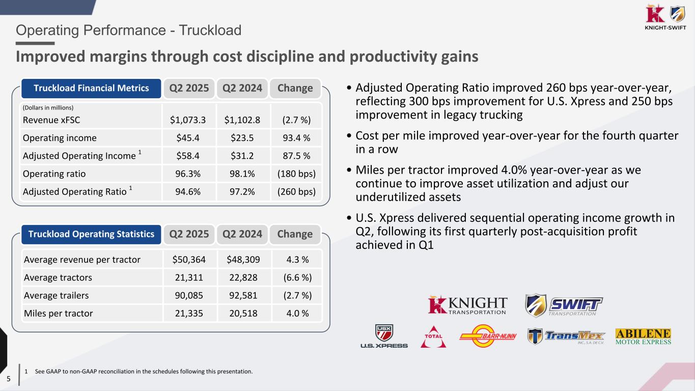 4 $1,073.3M $58.4M 94.6% ~15,400 irregular route and ~5,900 dedicated tractors $337.7M $23.4M 93.1% 176 service centers ~6,600 door count $128.3M $6.7M 94.8% Gross margin 18.9% $84.1M ($3.4M) 104.1% 602 tractors 12,543 containers 1 See GAAP to non-GAAP reconciliation in the schedules following this presentation 2 Excludes Trucking and LTL fuel Surcharge and intersegment transactions Q2 2025 Revenue Diversification Q2 2025 Segment Overview Improving Truckload performance while LTL grows into network OTR 45% / Dedicated 18% LTL 20% Truckload 63% Lo gis tic s 8 % Inte rmo dal 5 % Other 4% Revenue xFSC2 Adjusted Op Income1 Adjusted OR1 Truckload Less-than- Truckload Logistics Intermodal KNX 1.7B2