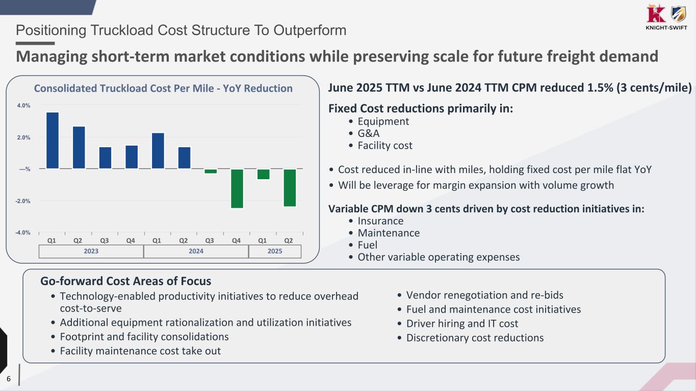 5 (Dollars in millions) Revenue xFSC $1,073.3 $1,102.8 (2.7 %) Operating income $45.4 $23.5 93.4 % Adjusted Operating Income 1 $58.4 $31.2 87.5 % Operating ratio 96.3% 98.1% (180 bps) Adjusted Operating Ratio 1 94.6% 97.2% (260 bps) Truckload Financial Metrics • Adjusted Operating Ratio improved 260 bps year-over-year, reflecting 300 bps improvement for U.S. Xpress and 250 bps improvement in legacy trucking • Cost per mile improved year-over-year for the fourth quarter in a row • Miles per tractor improved 4.0% year-over-year as we continue to improve asset utilization and adjust our underutilized assets • U.S. Xpress delivered sequential operating income growth in Q2, following its first quarterly post-acquisition profit achieved in Q1 Average revenue per tractor $50,364 $48,309 4.3 % Average tractors 21,311 22,828 (6.6 %) Average trailers 90,085 92,581 (2.7 %) Miles per tractor 21,335 20,518 4.0 % Operating Performance - Truckload Improved margins through cost discipline and productivity gains Q2 2025 Q2 2024 Change Truckload Operating Statistics Q2 2025 Q2 2024 Change 1 See GAAP to non-GAAP reconciliation in the schedules following this presentation.