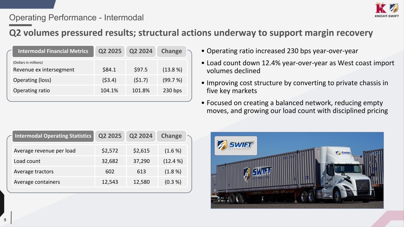 8 • 94.8% Adjusted Operating Ratio1 during the quarter, 70 bps improvement year-over-year • Revenue per load up 10.6% year-over-year with load count down 11.7% • Disciplined pricing strategy drove 100 bps improvement year- over-year in gross margin • Focused on profitable growth through selective carrier partnerships • Power-only capabilities continue to enhance asset utilization and diversify the freight mix Operating Performance - Logistics Growing income in soft market through price discipline and resilient model (Dollars in millions) Revenue ex intersegment $128.3 $131.7 (2.6 %) Operating income $5.5 $4.8 16.6 % Adjusted Operating Income 1 $6.7 $5.9 13.3 % Operating ratio 95.7% 96.4% (70 bps) Adjusted Operating Ratio 1 94.8% 95.5% (70 bps) Logistics Financial Metrics Revenue per load $2,025 $1,831 10.6 % Gross margin 18.9% 17.9% 100 bps Logistics Operating Statistics 1 See GAAP to non-GAAP reconciliation in the schedules following this presentation. Q2 2025 Q2 2024 Change Q2 2025 Q2 2024 Change