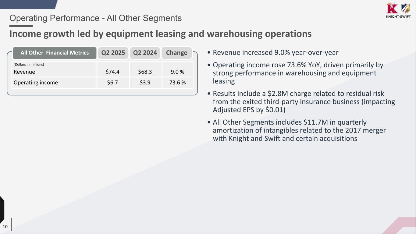 9 • Operating ratio increased 230 bps year-over-year • Load count down 12.4% year-over-year as West coast import volumes declined • Improving cost structure by converting to private chassis in five key markets • Focused on creating a balanced network, reducing empty moves, and growing our load count with disciplined pricing Operating Performance - Intermodal Q2 volumes pressured results; structural actions underway to support margin recovery (Dollars in millions) Revenue ex intersegment $84.1 $97.5 (13.8 %) Operating (loss) ($3.4) ($1.7) (99.7 %) Operating ratio 104.1% 101.8% 230 bps Intermodal Financial Metrics Average revenue per load $2,572 $2,615 (1.6 %) Load count 32,682 37,290 (12.4 %) Average tractors 602 613 (1.8 %) Average containers 12,543 12,580 (0.3 %) Intermodal Operating Statistics Q2 2025 Q2 2024 Change Q2 2025 Q2 2024 Change