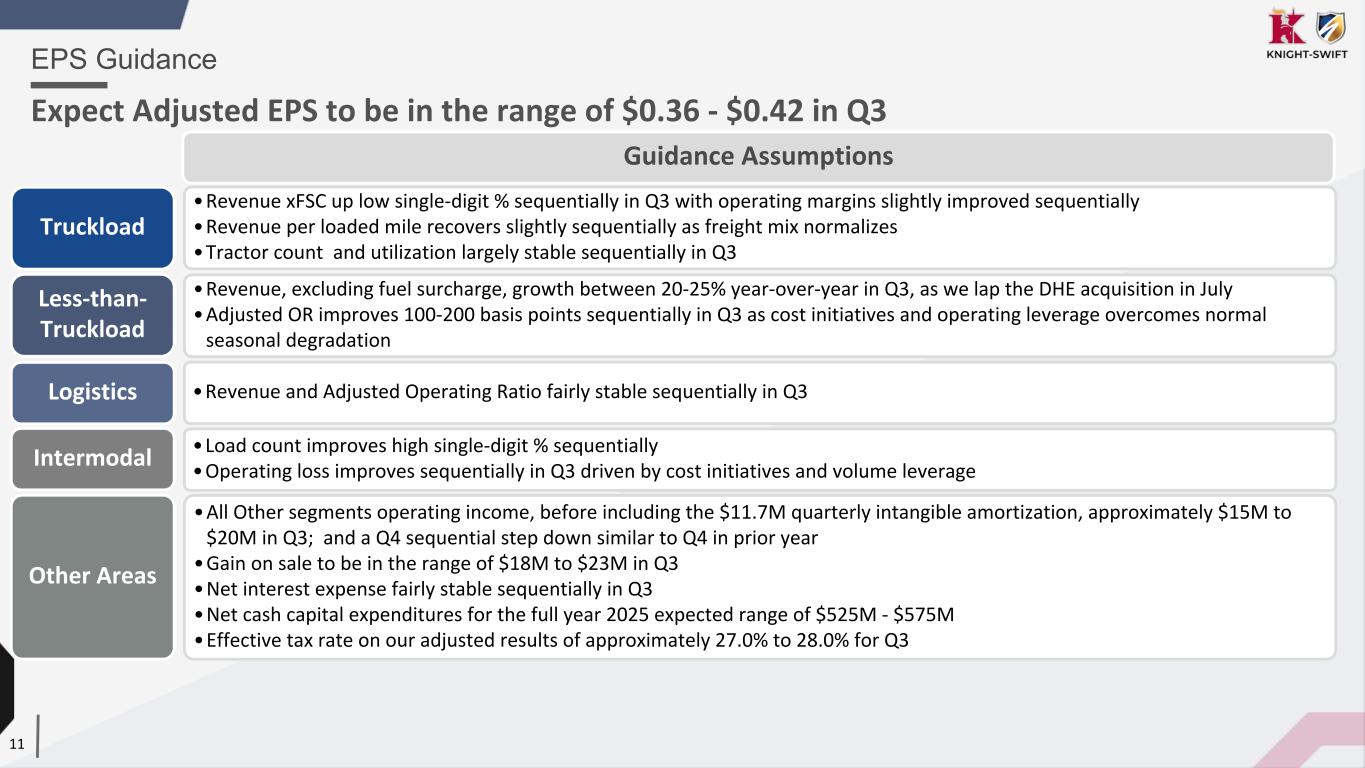 10 • Revenue increased 9.0% year-over-year • Operating income rose 73.6% YoY, driven primarily by strong performance in warehousing and equipment leasing • Results include a $2.8M charge related to residual risk from the exited third-party insurance business (impacting Adjusted EPS by $0.01) • All Other Segments includes $11.7M in quarterly amortization of intangibles related to the 2017 merger with Knight and Swift and certain acquisitions Operating Performance - All Other Segments Income growth led by equipment leasing and warehousing operations (Dollars in millions) Revenue $74.4 $68.3 9.0 % Operating income $6.7 $3.9 73.6 % All Other Financial Metrics Q2 2025 Q2 2024 Change