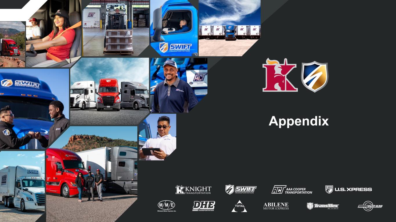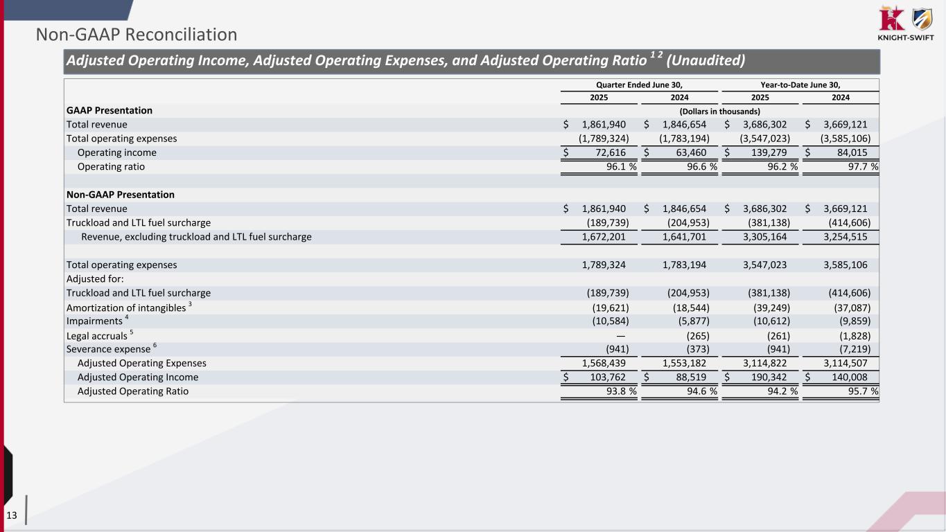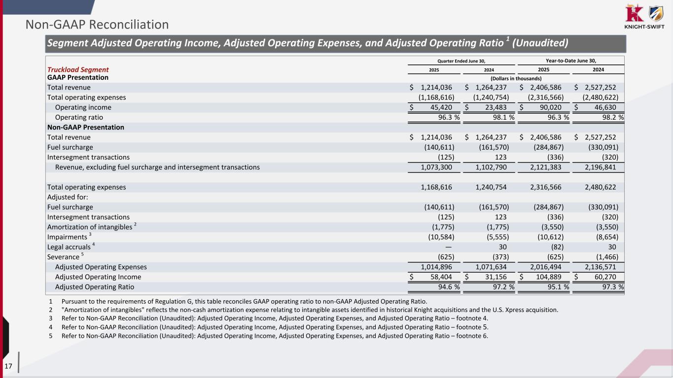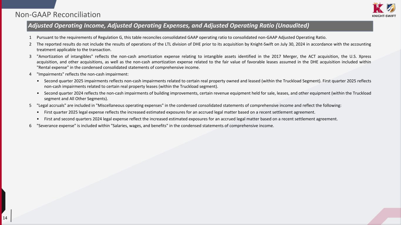 14 Adjusted Operating Income, Adjusted Operating Expenses, and Adjusted Operating Ratio (Unaudited) 1 Pursuant to the requirements of Regulation G, this table reconciles consolidated GAAP operating ratio to consolidated non-GAAP Adjusted Operating Ratio. 2 The reported results do not include the results of operations of the LTL division of DHE prior to its acquisition by Knight-Swift on July 30, 2024 in accordance with the accounting treatment applicable to the transaction. 3 "Amortization of intangibles" reflects the non-cash amortization expense relating to intangible assets identified in the 2017 Merger, the ACT acquisition, the U.S. Xpress acquisition, and other acquisitions, as well as the non-cash amortization expense related to the fair value of favorable leases assumed in the DHE acquisition included within "Rental expense" in the condensed consolidated statements of comprehensive income. 4 "Impairments" reflects the non-cash impairment: • Second quarter 2025 impairments reflects non-cash impairments related to certain real property owned and leased (within the Truckload Segment). First quarter 2025 reflects non-cash impairments related to certain real property leases (within the Truckload segment). • Second quarter 2024 reflects the non-cash impairments of building improvements, certain revenue equipment held for sale, leases, and other equipment (within the Truckload segment and All Other Segments). 5 "Legal accruals" are included in "Miscellaneous operating expenses" in the condensed consolidated statements of comprehensive income and reflect the following: • First quarter 2025 legal expense reflects the increased estimated exposures for an accrued legal matter based on a recent settlement agreement. • First and second quarters 2024 legal expense reflect the increased estimated exposures for an accrued legal matter based on a recent settlement agreement. 6 "Severance expense" is included within "Salaries, wages, and benefits" in the condensed statements of comprehensive income. Non-GAAP Reconciliation