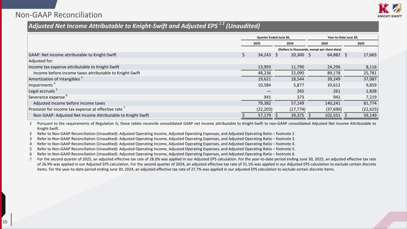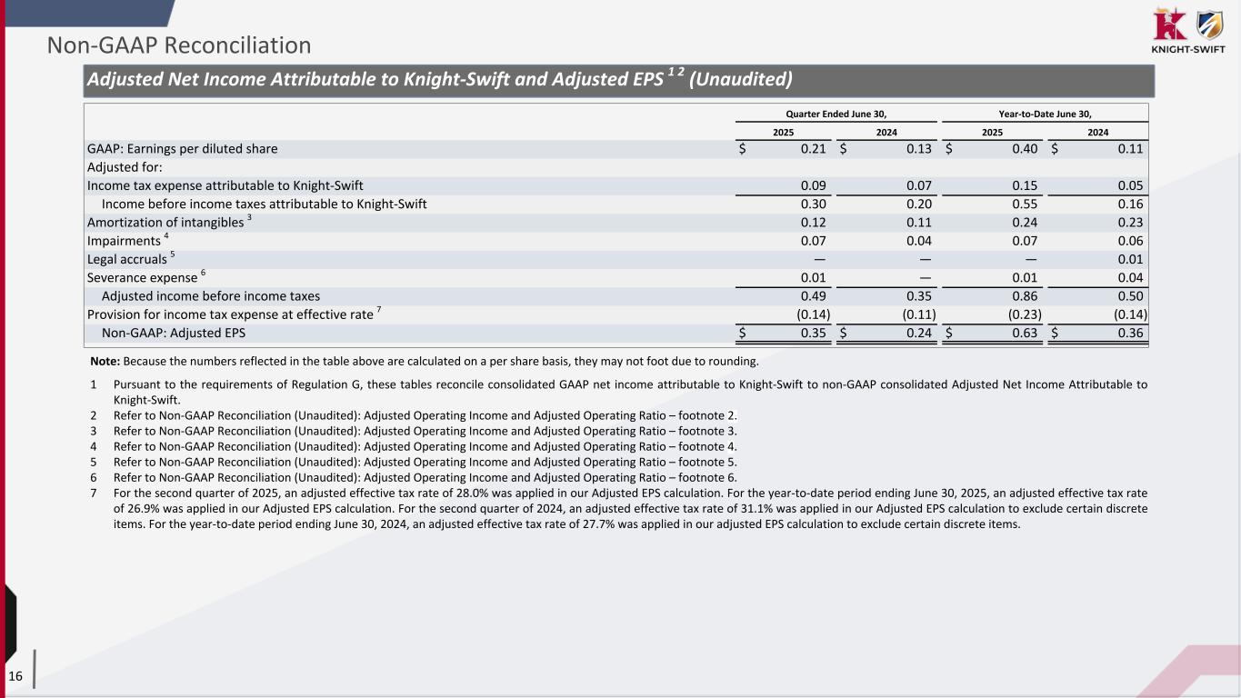 15 1 Pursuant to the requirements of Regulation G, these tables reconcile consolidated GAAP net income attributable to Knight-Swift to non-GAAP consolidated Adjusted Net Income Attributable to Knight-Swift. 2 Refer to Non-GAAP Reconciliation (Unaudited): Adjusted Operating Income, Adjusted Operating Expenses, and Adjusted Operating Ratio – footnote 2. 3 Refer to Non-GAAP Reconciliation (Unaudited): Adjusted Operating Income, Adjusted Operating Expenses, and Adjusted Operating Ratio – footnote 3. 4 Refer to Non-GAAP Reconciliation (Unaudited): Adjusted Operating Income, Adjusted Operating Expenses, and Adjusted Operating Ratio – footnote 4. 5 Refer to Non-GAAP Reconciliation (Unaudited): Adjusted Operating Income, Adjusted Operating Expenses, and Adjusted Operating Ratio – footnote 5. 6 Refer to Non-GAAP Reconciliation (Unaudited): Adjusted Operating Income, Adjusted Operating Expenses, and Adjusted Operating Ratio – footnote 6. 7 For the second quarter of 2025, an adjusted effective tax rate of 28.0% was applied in our Adjusted EPS calculation. For the year-to-date period ending June 30, 2025, an adjusted effective tax rate of 26.9% was applied in our Adjusted EPS calculation. For the second quarter of 2024, an adjusted effective tax rate of 31.1% was applied in our Adjusted EPS calculation to exclude certain discrete items. For the year-to-date period ending June 30, 2024, an adjusted effective tax rate of 27.7% was applied in our adjusted EPS calculation to exclude certain discrete items. Adjusted Net Income Attributable to Knight-Swift and Adjusted EPS 1 2 (Unaudited) Quarter Ended June 30, Year-to-Date June 30, 2025 2024 2025 2024 (Dollars in thousands, except per share data) GAAP: Net income attributable to Knight-Swift $ 34,243 $ 20,300 $ 64,882 $ 17,665 Adjusted for: Income tax expense attributable to Knight-Swift 13,993 11,790 24,296 8,116 Income before income taxes attributable to Knight-Swift 48,236 32,090 89,178 25,781 Amortization of intangibles 3 19,621 18,544 39,249 37,087 Impairments 4 10,584 5,877 10,612 9,859 Legal accruals 5 — 265 261 1,828 Severance expense 6 941 373 941 7,219 Adjusted income before income taxes 79,382 57,149 140,241 81,774 Provision for income tax expense at effective rate 7 (22,203) (17,774) (37,690) (22,625) Non-GAAP: Adjusted Net Income Attributable to Knight-Swift $ 57,179 $ 39,375 $ 102,551 $ 59,149 Non-GAAP Reconciliation