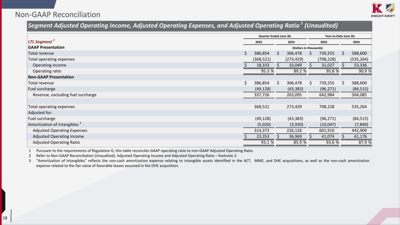 17 Segment Adjusted Operating Income, Adjusted Operating Expenses, and Adjusted Operating Ratio 1 (Unaudited) Quarter Ended June 30, Year-to-Date June 30, Truckload Segment 2025 2024 2025 2024 GAAP Presentation (Dollars in thousands) Total revenue $ 1,214,036 $ 1,264,237 $ 2,406,586 $ 2,527,252 Total operating expenses (1,168,616) (1,240,754) (2,316,566) (2,480,622) Operating income $ 45,420 $ 23,483 $ 90,020 $ 46,630 Operating ratio 96.3 % 98.1 % 96.3 % 98.2 % Non-GAAP Presentation Total revenue $ 1,214,036 $ 1,264,237 $ 2,406,586 $ 2,527,252 Fuel surcharge (140,611) (161,570) (284,867) (330,091) Intersegment transactions (125) 123 (336) (320) Revenue, excluding fuel surcharge and intersegment transactions 1,073,300 1,102,790 2,121,383 2,196,841 Total operating expenses 1,168,616 1,240,754 2,316,566 2,480,622 Adjusted for: Fuel surcharge (140,611) (161,570) (284,867) (330,091) Intersegment transactions (125) 123 (336) (320) Amortization of intangibles 2 (1,775) (1,775) (3,550) (3,550) Impairments 3 (10,584) (5,555) (10,612) (8,654) Legal accruals 4 — 30 (82) 30 Severance 5 (625) (373) (625) (1,466) Adjusted Operating Expenses 1,014,896 1,071,634 2,016,494 2,136,571 Adjusted Operating Income $ 58,404 $ 31,156 $ 104,889 $ 60,270 Adjusted Operating Ratio 94.6 % 97.2 % 95.1 % 97.3 % 1 Pursuant to the requirements of Regulation G, this table reconciles GAAP operating ratio to non-GAAP Adjusted Operating Ratio. 2 "Amortization of intangibles" reflects the non-cash amortization expense relating to intangible assets identified in historical Knight acquisitions and the U.S. Xpress acquisition. 3 Refer to Non-GAAP Reconciliation (Unaudited): Adjusted Operating Income, Adjusted Operating Expenses, and Adjusted Operating Ratio – footnote 4. 4 Refer to Non-GAAP Reconciliation (Unaudited): Adjusted Operating Income, Adjusted Operating Expenses, and Adjusted Operating Ratio – footnote 5. 5 Refer to Non-GAAP Reconciliation (Unaudited): Adjusted Operating Income, Adjusted Operating Expenses, and Adjusted Operating Ratio – footnote 6. Non-GAAP Reconciliation