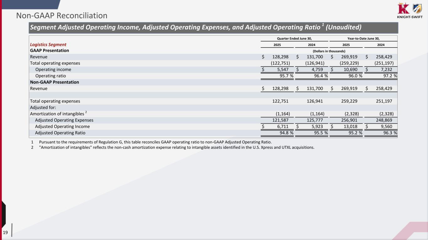 18 Segment Adjusted Operating Income, Adjusted Operating Expenses, and Adjusted Operating Ratio 1 (Unaudited) Quarter Ended June 30, Year-to-Date June 30, LTL Segment 2 2025 2024 2025 2024 GAAP Presentation (Dollars in thousands) Total revenue $ 386,854 $ 306,478 $ 739,255 $ 588,600 Total operating expenses (368,521) (273,429) (708,228) (535,264) Operating income $ 18,333 $ 33,049 $ 31,027 $ 53,336 Operating ratio 95.3 % 89.2 % 95.8 % 90.9 % Non-GAAP Presentation Total revenue $ 386,854 $ 306,478 $ 739,255 $ 588,600 Fuel surcharge (49,128) (43,383) (96,271) (84,515) Revenue, excluding fuel surcharge 337,726 263,095 642,984 504,085 Total operating expenses 368,521 273,429 708,228 535,264 Adjusted for: Fuel surcharge (49,128) (43,383) (96,271) (84,515) Amortization of intangibles 3 (5,020) (3,920) (10,047) (7,840) Adjusted Operating Expenses 314,373 226,126 601,910 442,909 Adjusted Operating Income $ 23,353 $ 36,969 $ 41,074 $ 61,176 Adjusted Operating Ratio 93.1 % 85.9 % 93.6 % 87.9 % 1 Pursuant to the requirements of Regulation G, this table reconciles GAAP operating ratio to non-GAAP Adjusted Operating Ratio. 2 Refer to Non-GAAP Reconciliation (Unaudited): Adjusted Operating Income and Adjusted Operating Ratio – footnote 2. 3 "Amortization of intangibles" reflects the non-cash amortization expense relating to intangible assets identified in the ACT, MME, and DHE acquisitions, as well as the non-cash amortization expense related to the fair value of favorable leases assumed in the DHE acquisition. Non-GAAP Reconciliation