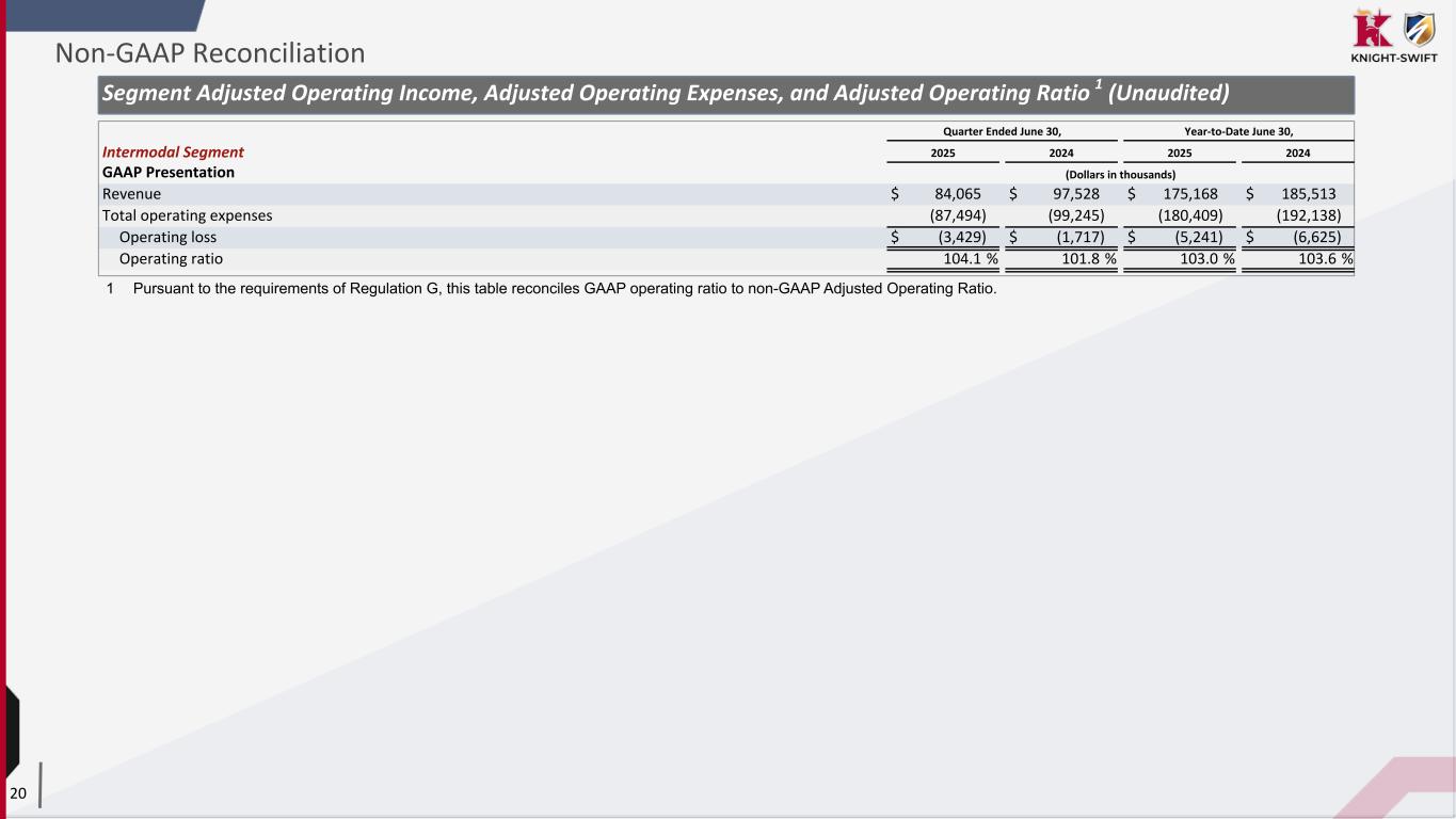 19 Quarter Ended June 30, Year-to-Date June 30, Logistics Segment 2025 2024 2025 2024 GAAP Presentation (Dollars in thousands) Revenue $ 128,298 $ 131,700 $ 269,919 $ 258,429 Total operating expenses (122,751) (126,941) (259,229) (251,197) Operating income $ 5,547 $ 4,759 $ 10,690 $ 7,232 Operating ratio 95.7 % 96.4 % 96.0 % 97.2 % Non-GAAP Presentation Revenue $ 128,298 $ 131,700 $ 269,919 $ 258,429 Total operating expenses 122,751 126,941 259,229 251,197 Adjusted for: Amortization of intangibles 2 (1,164) (1,164) (2,328) (2,328) Adjusted Operating Expenses 121,587 125,777 256,901 248,869 Adjusted Operating Income $ 6,711 $ 5,923 $ 13,018 $ 9,560 Adjusted Operating Ratio 94.8 % 95.5 % 95.2 % 96.3 % Segment Adjusted Operating Income, Adjusted Operating Expenses, and Adjusted Operating Ratio 1 (Unaudited) 1 Pursuant to the requirements of Regulation G, this table reconciles GAAP operating ratio to non-GAAP Adjusted Operating Ratio. 2 "Amortization of intangibles" reflects the non-cash amortization expense relating to intangible assets identified in the U.S. Xpress and UTXL acquisitions. Non-GAAP Reconciliation