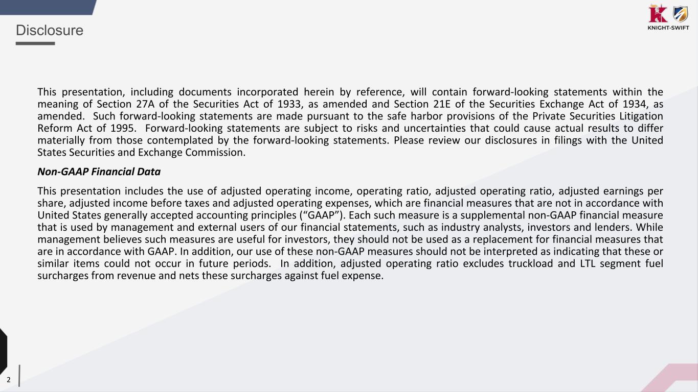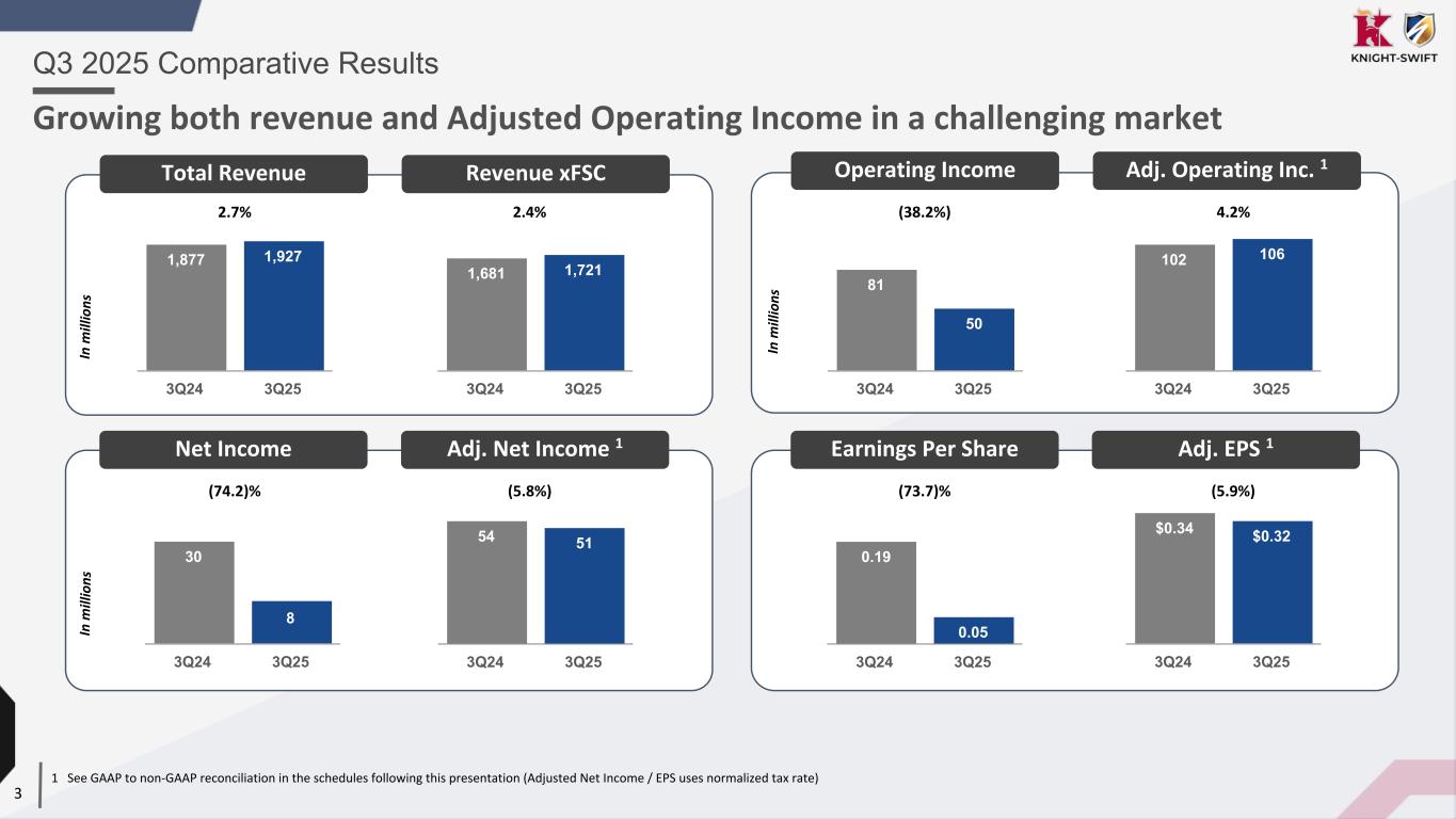2 This presentation, including documents incorporated herein by reference, will contain forward-looking statements within the meaning of Section 27A of the Securities Act of 1933, as amended and Section 21E of the Securities Exchange Act of 1934, as amended. Such forward-looking statements are made pursuant to the safe harbor provisions of the Private Securities Litigation Reform Act of 1995. Forward-looking statements are subject to risks and uncertainties that could cause actual results to differ materially from those contemplated by the forward-looking statements. Please review our disclosures in filings with the United States Securities and Exchange Commission. Non-GAAP Financial Data This presentation includes the use of adjusted operating income, operating ratio, adjusted operating ratio, adjusted earnings per share, adjusted income before taxes and adjusted operating expenses, which are financial measures that are not in accordance with United States generally accepted accounting principles (“GAAP”). Each such measure is a supplemental non-GAAP financial measure that is used by management and external users of our financial statements, such as industry analysts, investors and lenders. While management believes such measures are useful for investors, they should not be used as a replacement for financial measures that are in accordance with GAAP. In addition, our use of these non-GAAP measures should not be interpreted as indicating that these or similar items could not occur in future periods. In addition, adjusted operating ratio excludes truckload and LTL segment fuel surcharges from revenue and nets these surcharges against fuel expense. Disclosure