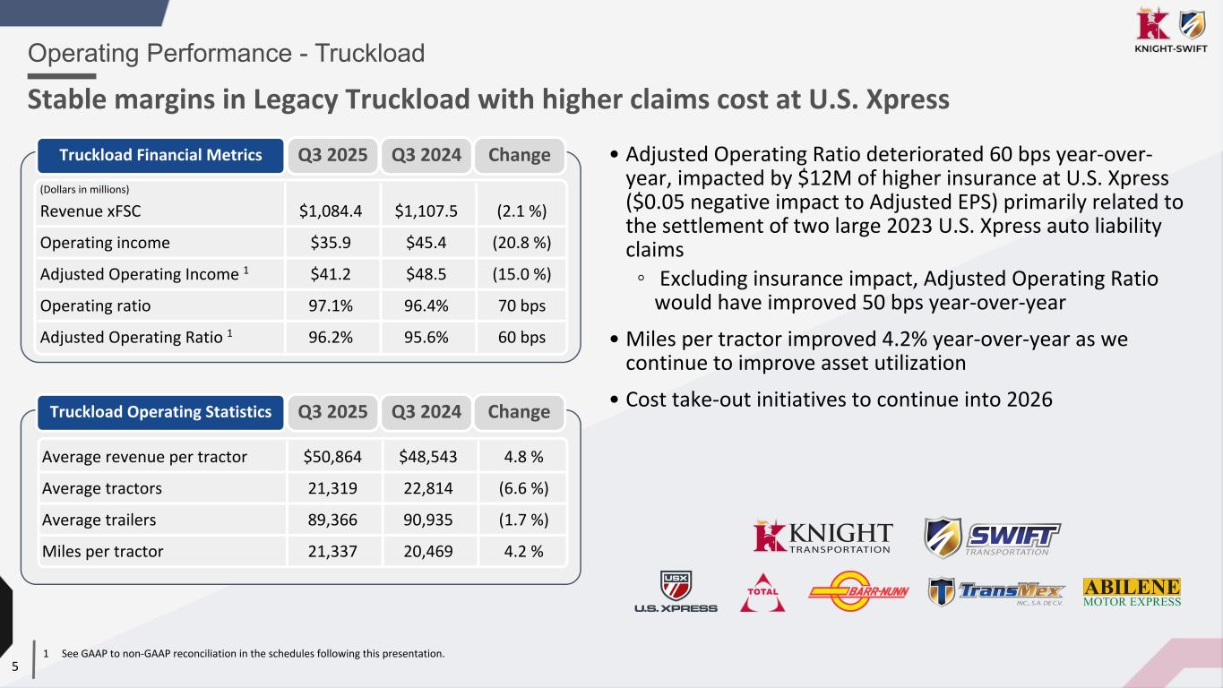 4 $1,084.4M $41.2M 96.2% ~15,400 irregular route and ~5,900 dedicated tractors $340.5M $32.1M 90.6% 177 service centers ~6,600 door count $140.4M $8.0M 94.3% Gross margin 17.8% $94.1M $0.2M 99.8% 573 tractors 12,535 containers 1 See GAAP to non-GAAP reconciliation in the schedules following this presentation 2 Excludes Trucking and LTL fuel Surcharge and intersegment transactions Q3 2025 Revenue Diversification Q3 2025 Segment Overview LTL becoming a meaningful share of business, increasing earnings diversification OTR 45% / Dedicated 17% LTL 20% Truckload 62% Lo gis tic s 8 % Inte rmo dal 5% Other 5% Revenue xFSC2 Adjusted Op Income1 Adjusted OR1 Truckload Less-than- Truckload Logistics Intermodal KNX 1.7B2