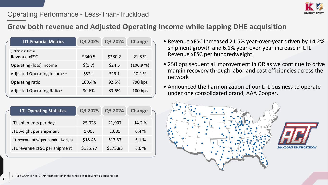 5 (Dollars in millions) Revenue xFSC $1,084.4 $1,107.5 (2.1 %) Operating income $35.9 $45.4 (20.8 %) Adjusted Operating Income 1 $41.2 $48.5 (15.0 %) Operating ratio 97.1% 96.4% 70 bps Adjusted Operating Ratio 1 96.2% 95.6% 60 bps Truckload Financial Metrics • Adjusted Operating Ratio deteriorated 60 bps year-over- year, impacted by $12M of higher insurance at U.S. Xpress ($0.05 negative impact to Adjusted EPS) primarily related to the settlement of two large 2023 U.S. Xpress auto liability claims ◦ Excluding insurance impact, Adjusted Operating Ratio would have improved 50 bps year-over-year • Miles per tractor improved 4.2% year-over-year as we continue to improve asset utilization • Cost take-out initiatives to continue into 2026 Average revenue per tractor $50,864 $48,543 4.8 % Average tractors 21,319 22,814 (6.6 %) Average trailers 89,366 90,935 (1.7 %) Miles per tractor 21,337 20,469 4.2 % Operating Performance - Truckload Stable margins in Legacy Truckload with higher claims cost at U.S. Xpress Q3 2025 Q3 2024 Change Truckload Operating Statistics Q3 2025 Q3 2024 Change 1 See GAAP to non-GAAP reconciliation in the schedules following this presentation.