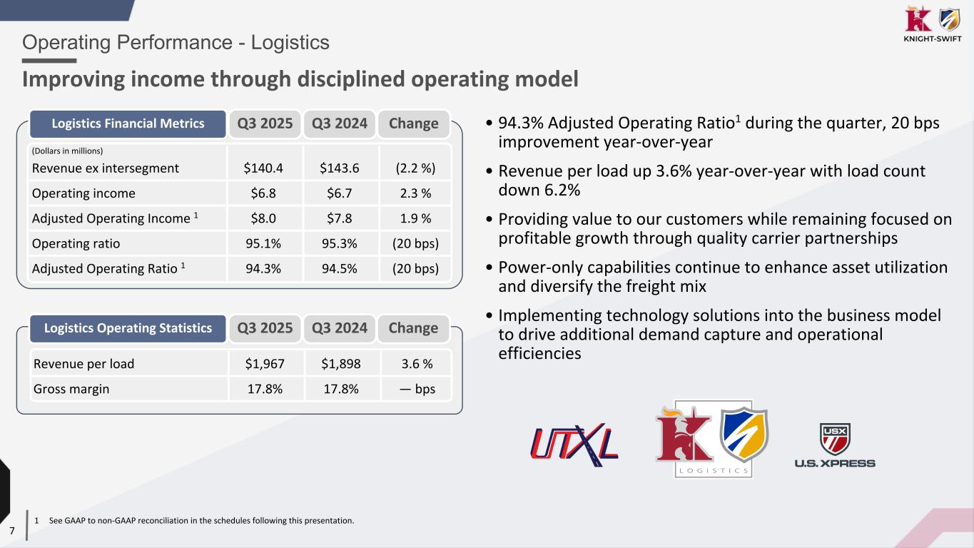 6 LTL shipments per day 25,028 21,907 14.2 % LTL weight per shipment 1,005 1,001 0.4 % LTL revenue xFSC per hundredweight $18.43 $17.37 6.1 % LTL revenue xFSC per shipment $185.27 $173.83 6.6 % Operating Performance - Less-Than-Truckload Grew both revenue and Adjusted Operating Income while lapping DHE acquisition (Dollars in millions) Revenue xFSC $340.5 $280.2 21.5 % Operating (loss) income $(1.7) $24.6 (106.9 %) Adjusted Operating Income 1 $32.1 $29.1 10.1 % Operating ratio 100.4% 92.5% 790 bps Adjusted Operating Ratio 1 90.6% 89.6% 100 bps LTL Financial Metrics LTL Operating Statistics 1 See GAAP to non-GAAP reconciliation in the schedules following this presentation. • Revenue xFSC increased 21.5% year-over-year driven by 14.2% shipment growth and 6.1% year-over-year increase in LTL Revenue xFSC per hundredweight • 250 bps sequential improvement in OR as we continue to drive margin recovery through labor and cost efficiencies across the network • Announced the harmonization of our LTL business to operate under one consolidated brand, AAA Cooper. Q3 2025 Q3 2024 Change Q3 2025 Q3 2024 Change